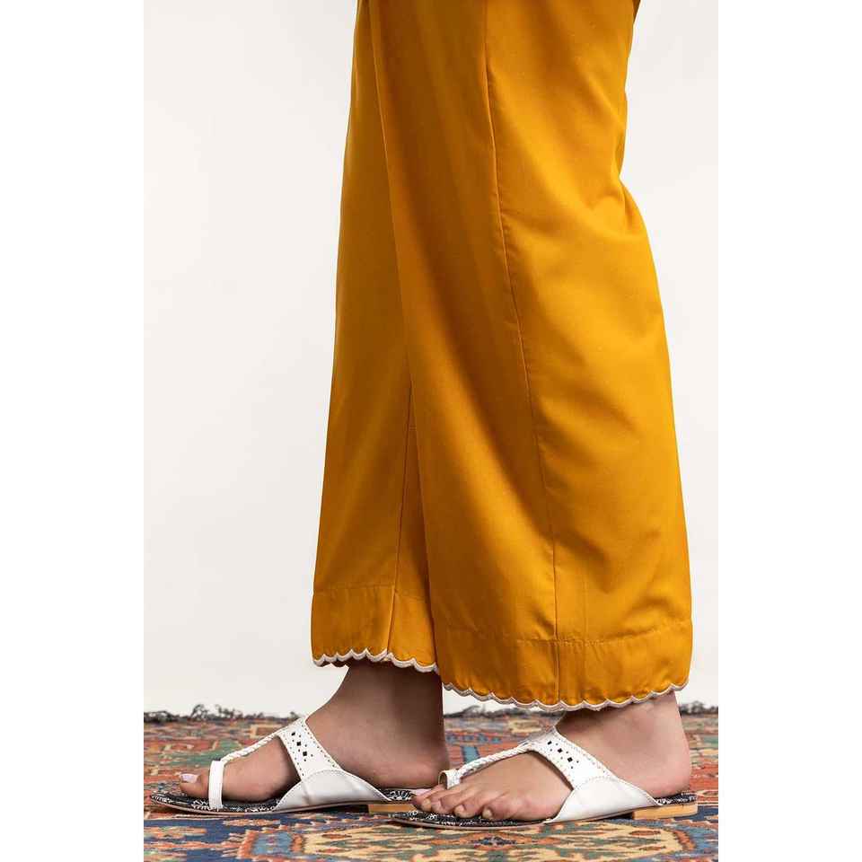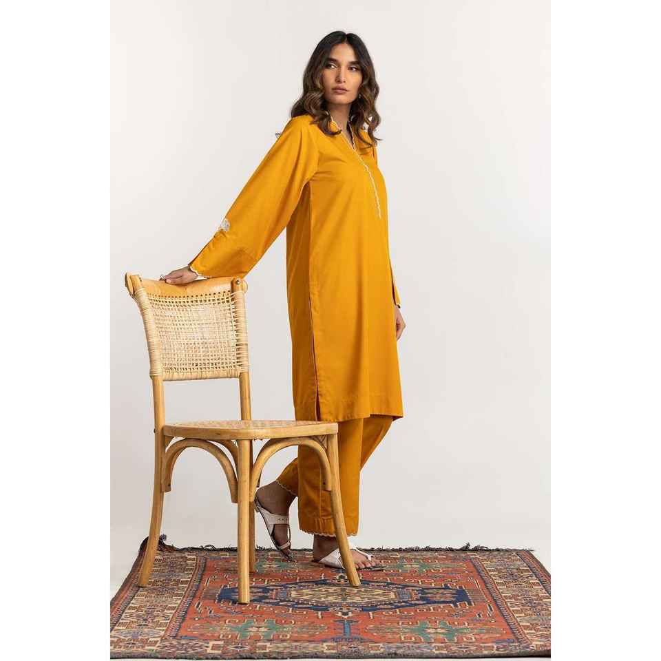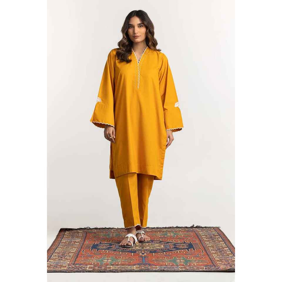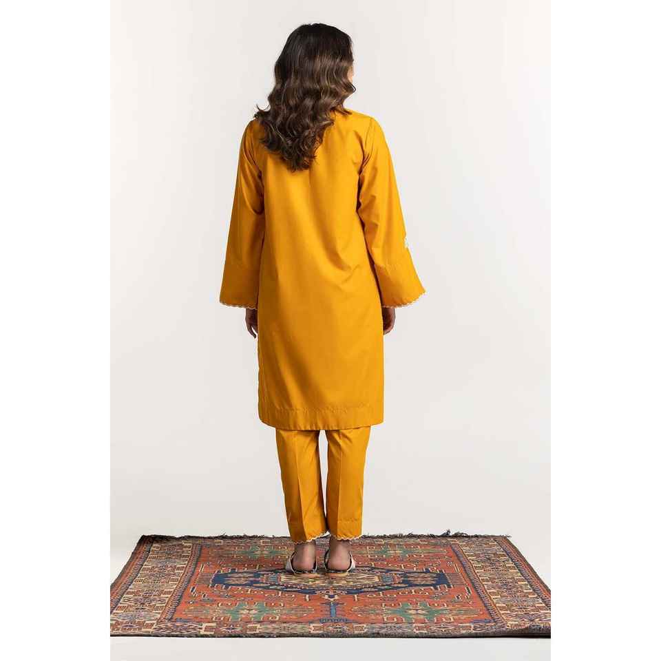 ชุดเซ็ตผ้าเครปปักลายผสมผสานสีมัสตาร์ดสำหรับผู้หญิง ชุดสองชิ้นความยาวเหนือเข่า ไซส์ XS และ XXS