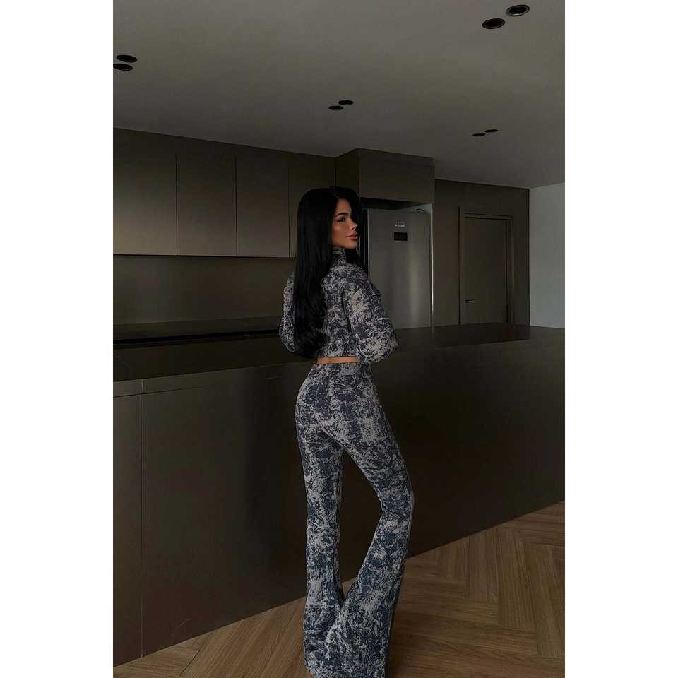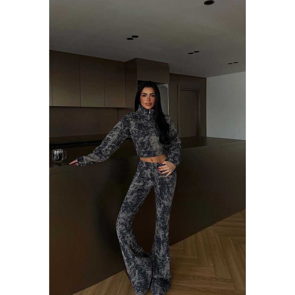 ชุดสูทครอปพิมพ์ลายสีน้ำเงินกรมท่าสำหรับผู้หญิง