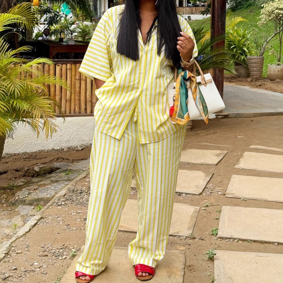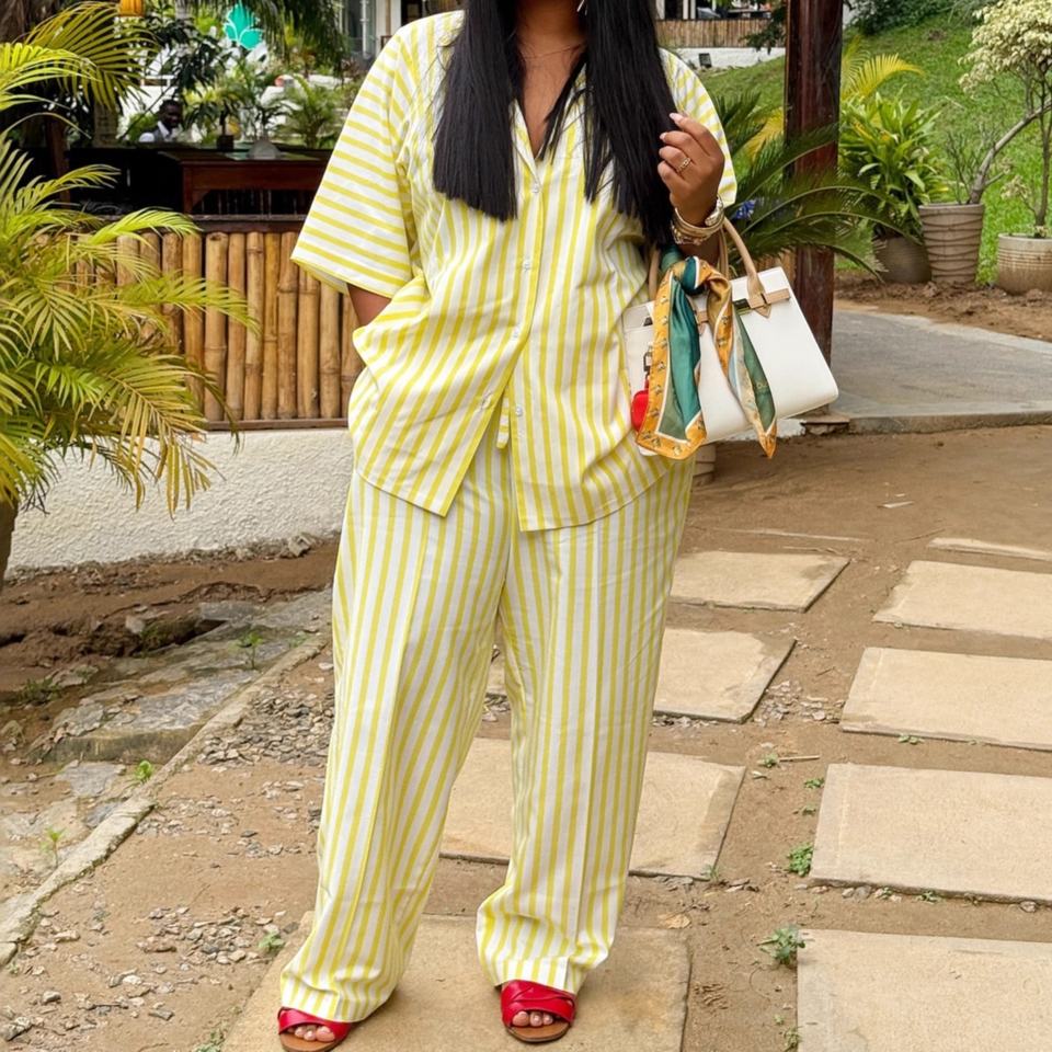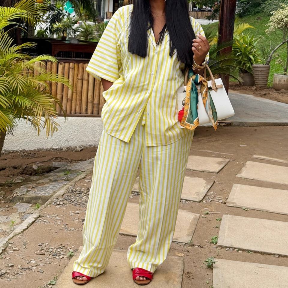 ชุดเซ็ต 2 ชิ้นแฟชั่นลำลองสไตล์แอฟริกันสำหรับผู้หญิง ลายทาง แขนสั้น เสื้อโอเวอร์ไซส์ กางเกงเอวสูง รุ่นใหม่ล่าสุด