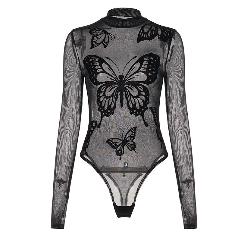 จั๊มสูทผ้าโปร่งแขนยาวพิมพ์ลายผีเสื้อคอกลมสำหรับผู้หญิงดีไซน์เซ็กซี่สินค้าออกใหม่ฤดูร้อน