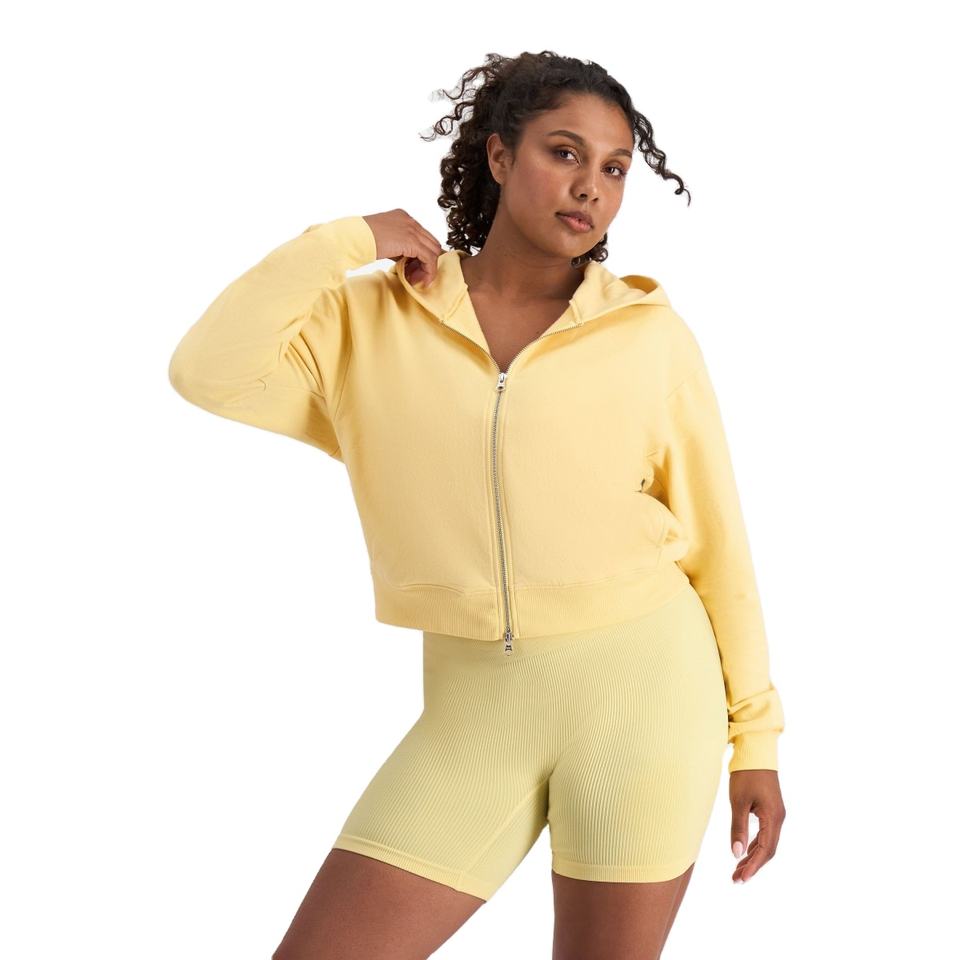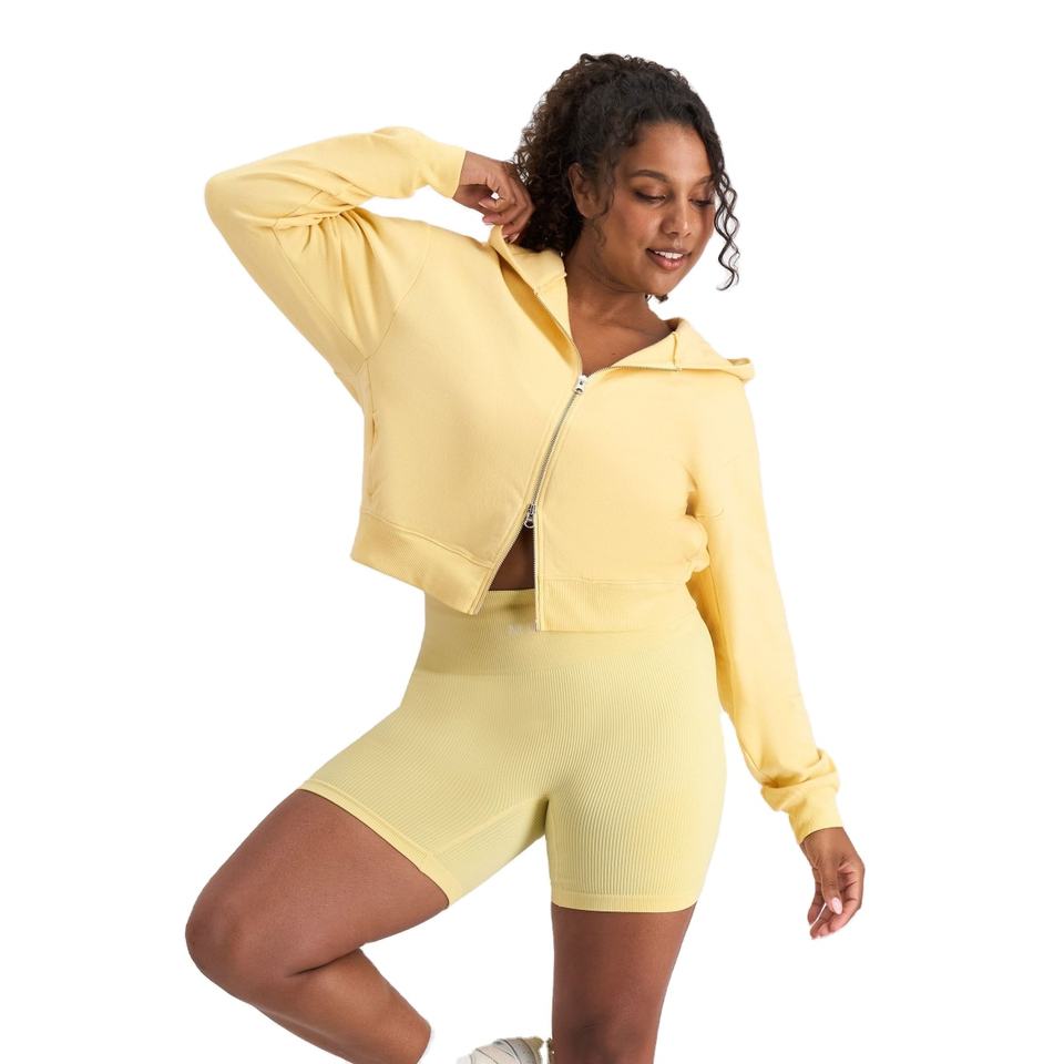 เสื้อฮู้ดครอปสีเหลืองแบบมีซิปคู่แฟชั่นใหม่สำหรับผู้หญิง เสื้อสเวตเชิ้ตแขนยาวลำลองผ้าฟลีซสำหรับสาวๆ เสื้อฮู้ดมีซิป