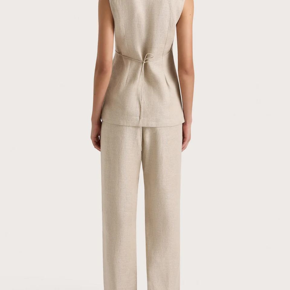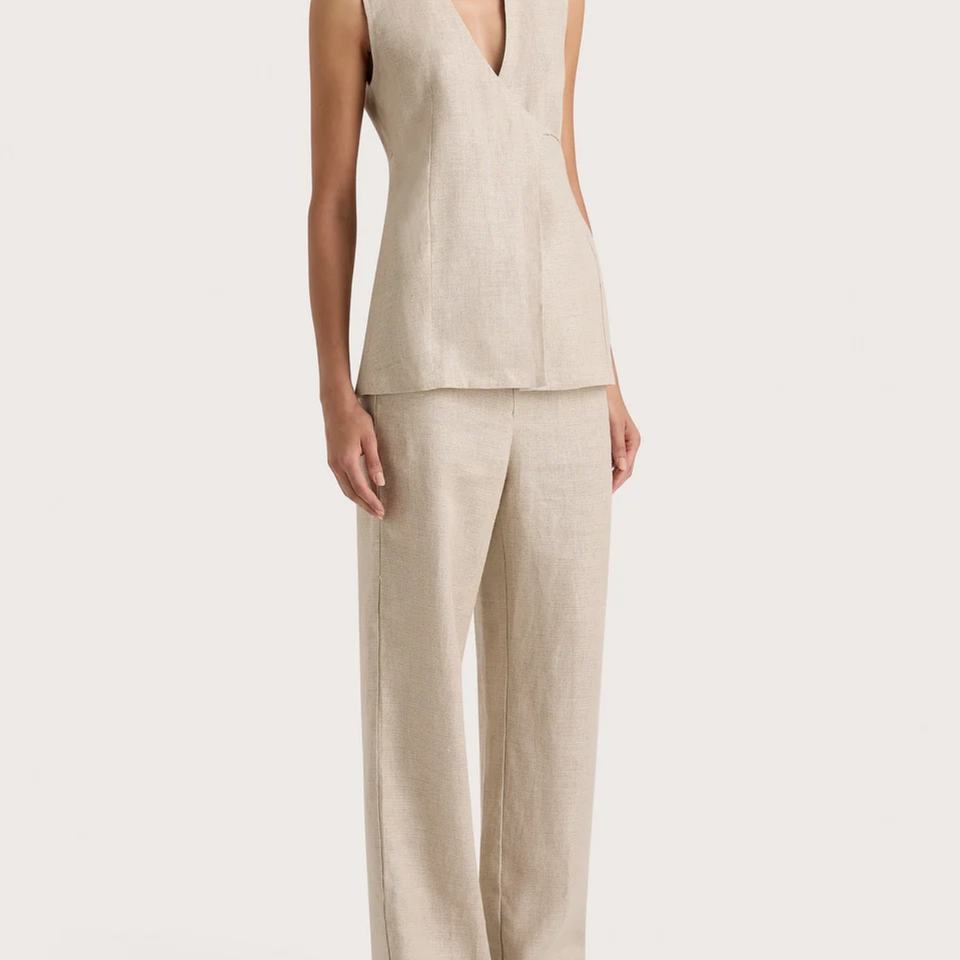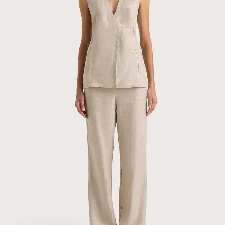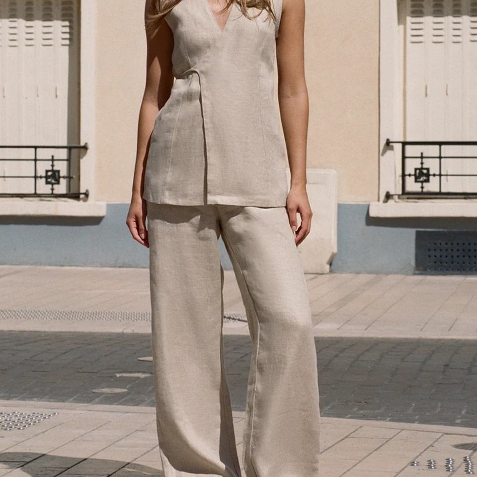 ชุดเซ็ต 2 ชิ้น แฟชั่นใหม่สำหรับผู้หญิง ผ้าลินินซาตินลายแจ็คการ์ด เสื้อแขนกุดและกางเกงขายาวทรงกว้าง ลายเรียบ สไตล์ลำลอง
