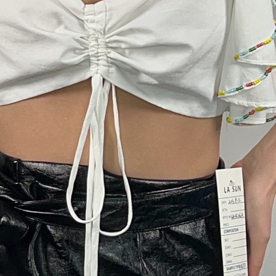 เสื้อครอปท็อปแฟชั่นใหม่สำหรับผู้หญิง สีขาว เปิดไหล่ เซ็กซี่ แต่งลูกปัด พิมพ์ลายลำลอง ผ้าฝ้ายและผ้าลินิน สำหรับฤดูร้อน-LA-RL1060A