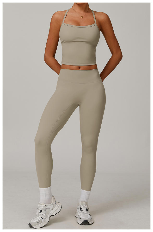 ชุดโยคะผู้หญิงแบบไร้สายรัดไหล่ คอวี เอวสูง ยกกระชับรูปร่าง ชุดออกกำลังกายแบบเปิดหลัง มีกระเป๋า ด้านหน้าสีพื้น แห้งเร็ว เหมาะสำหรับวิ่ง