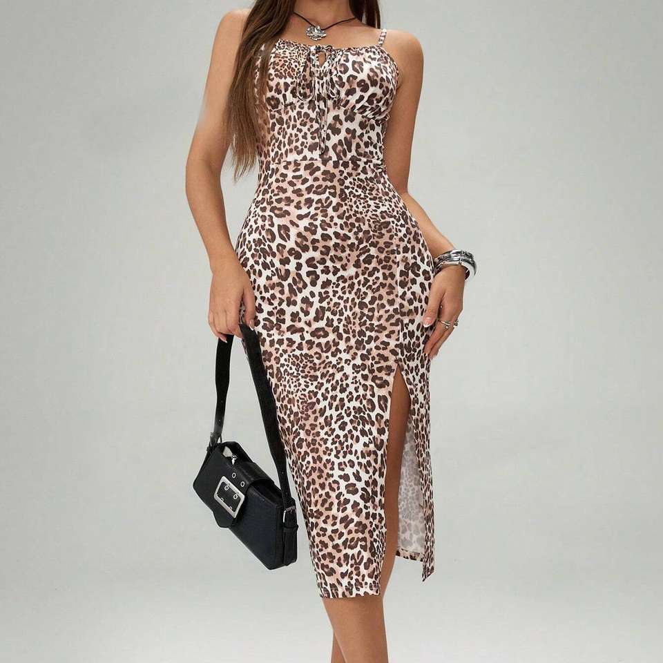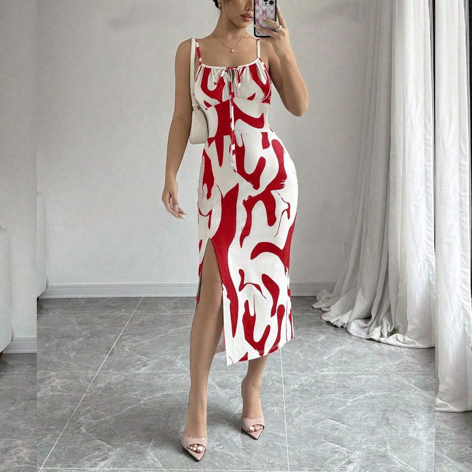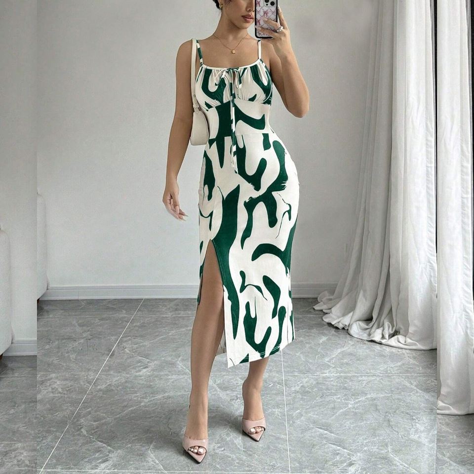 เดรสแฟชั่นแบบผูกคอพิมพ์ลายสุ่มสำหรับผู้หญิงรุ่นใหม่