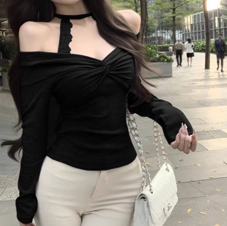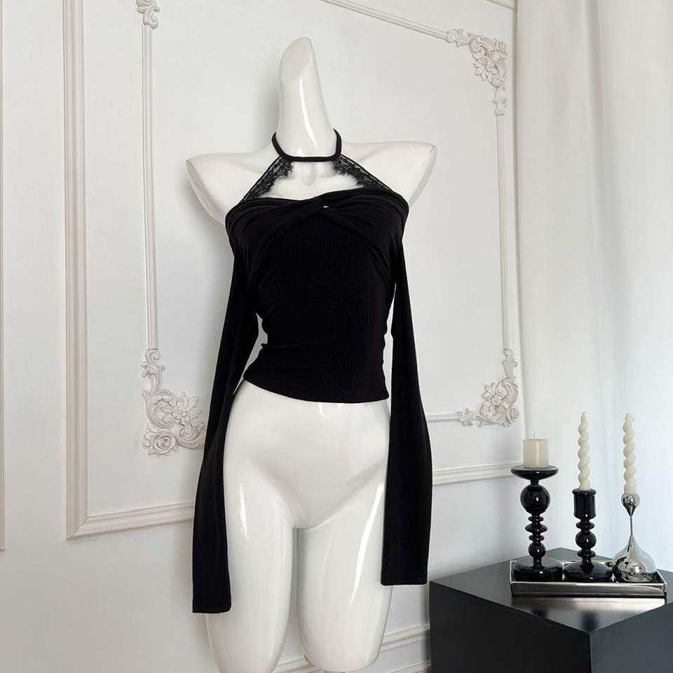 เสื้อครอปแขนยาวผู้หญิงแบบเปิดไหล่ผูกคอ แต่งลูกไม้ ผ้าริบ เสื้อแฟชั่น