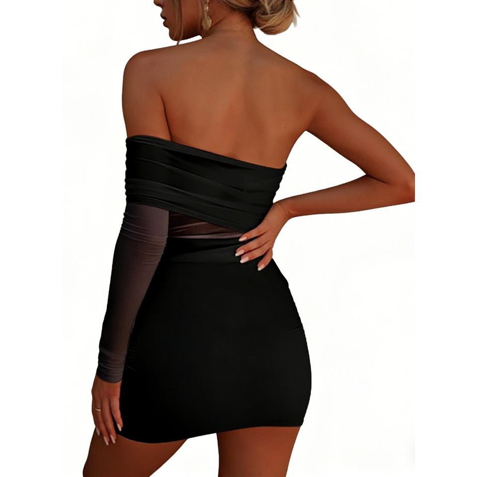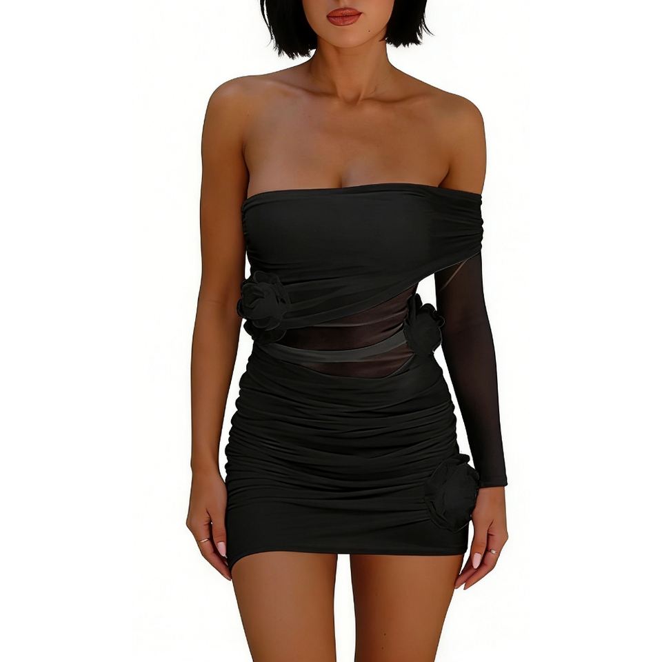 เดรสมินิเดรสแขนตาข่ายรัดรูปสำหรับผู้หญิง - ชุดเดรสปาร์ตี้ประดับดอกไม้ 3 มิติ แฟชั่น