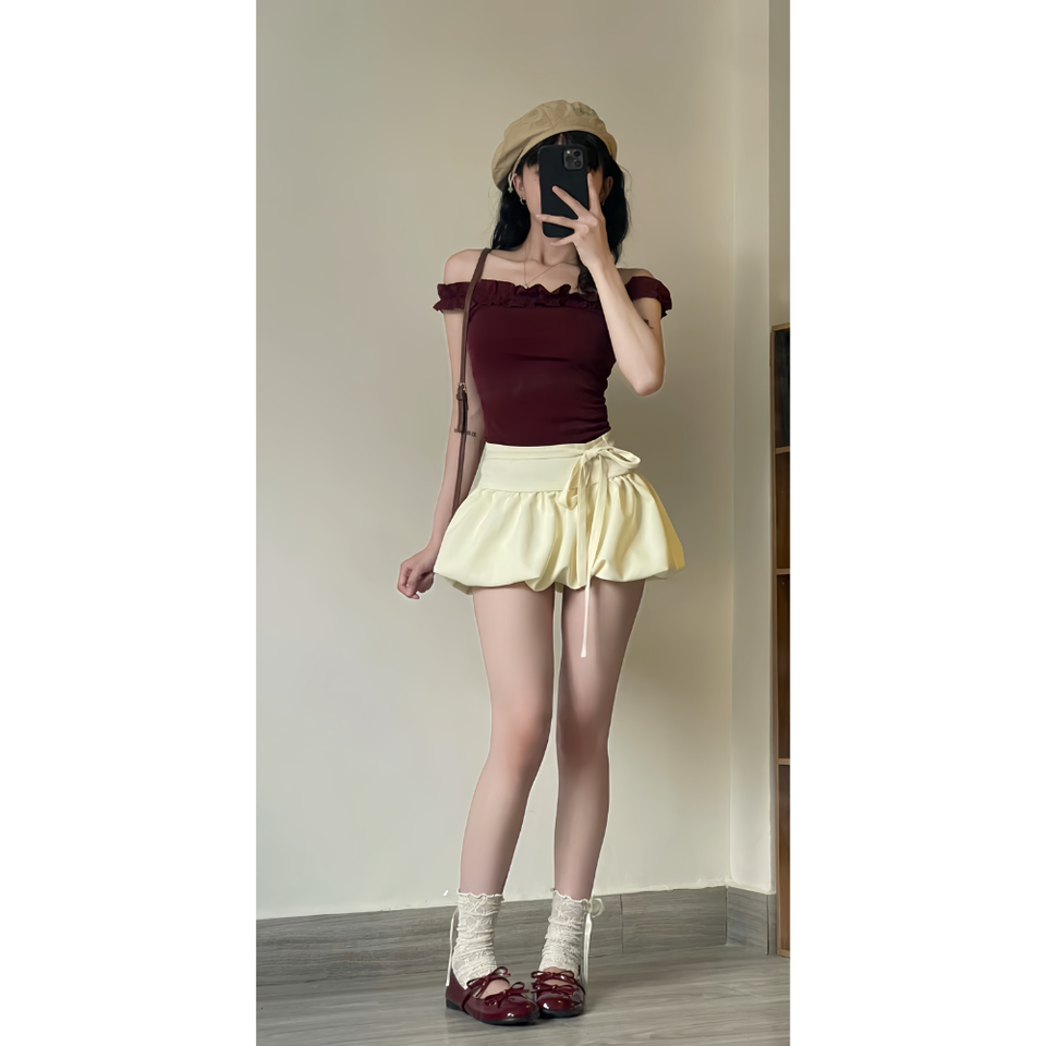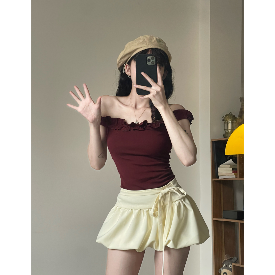 เสื้อเปิดไหล่ผู้หญิง แต่งระบาย แบรนด์ MISOUL ผลิตจากผ้าฝ้ายเจอร์ซีย์เกาหลีแบบอัดแน่น เป็นมิตรต่อสิ่งแวดล้อม ทรงเข้ารูป พร้อมดีไซน์จับจีบช่วงอก