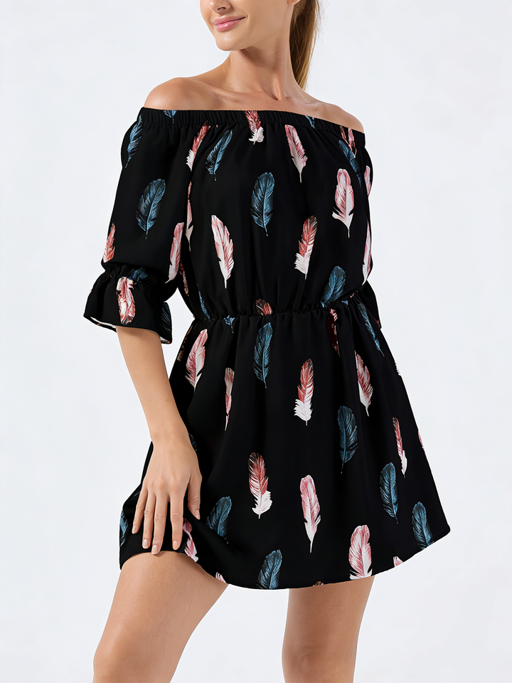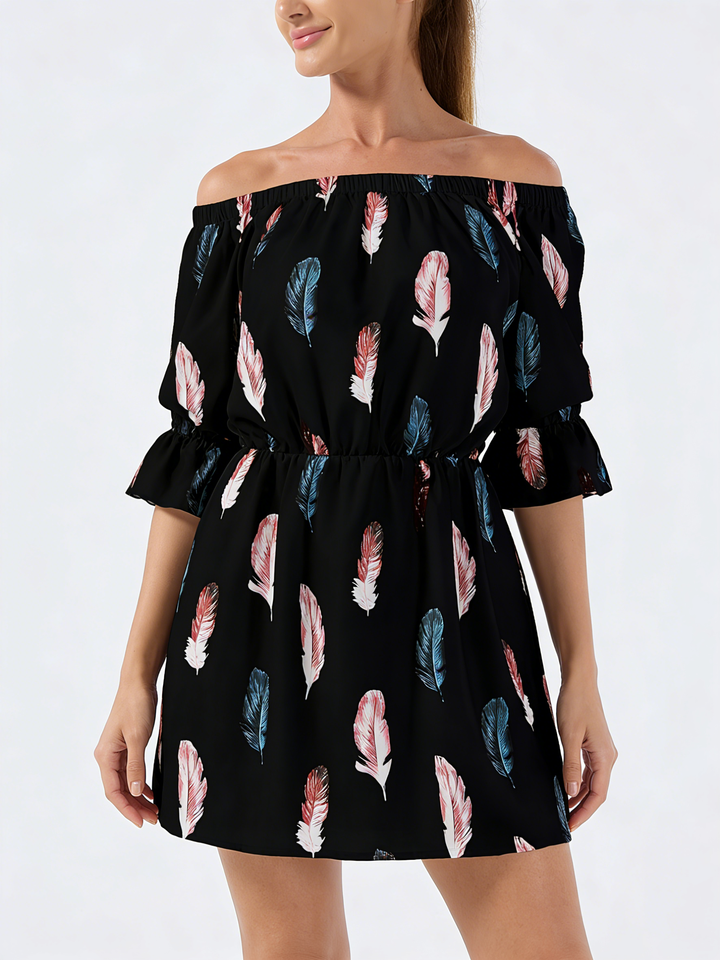เดรสทรงเอไลน์ยาวคลุมเข่าพิมพ์ลายขนนกแบบเปิดไหล่สำหรับผู้หญิง แขนจั๊มพ์ปลายบาน เอวธรรมชาติ เหมาะสำหรับใส่พักผ่อนในฤดูร้อน