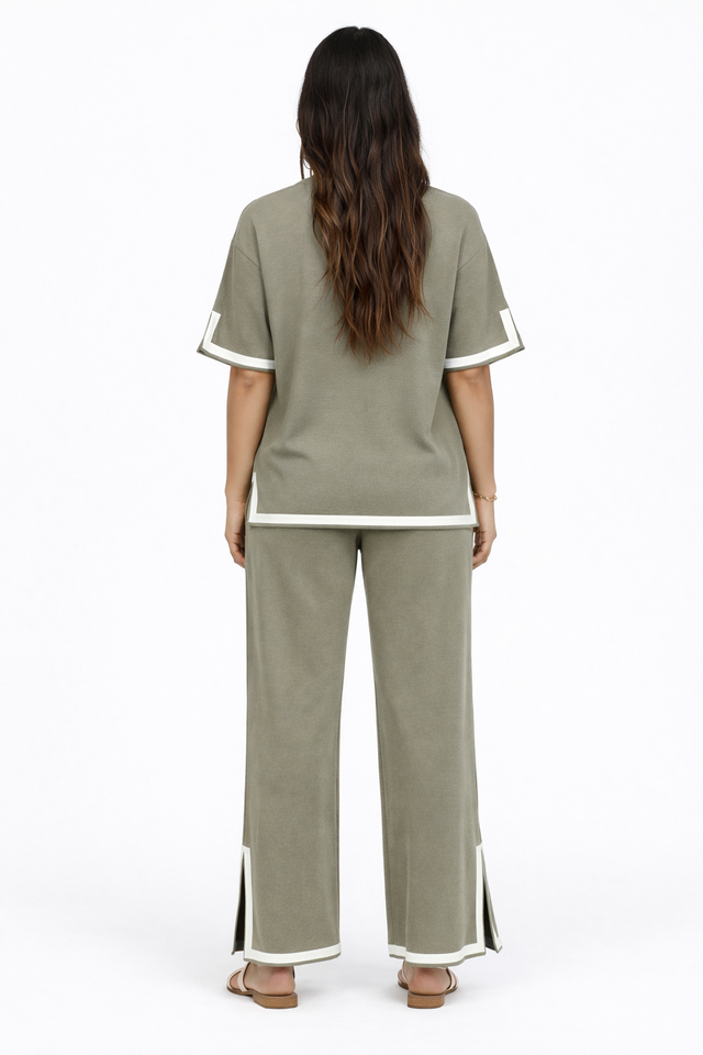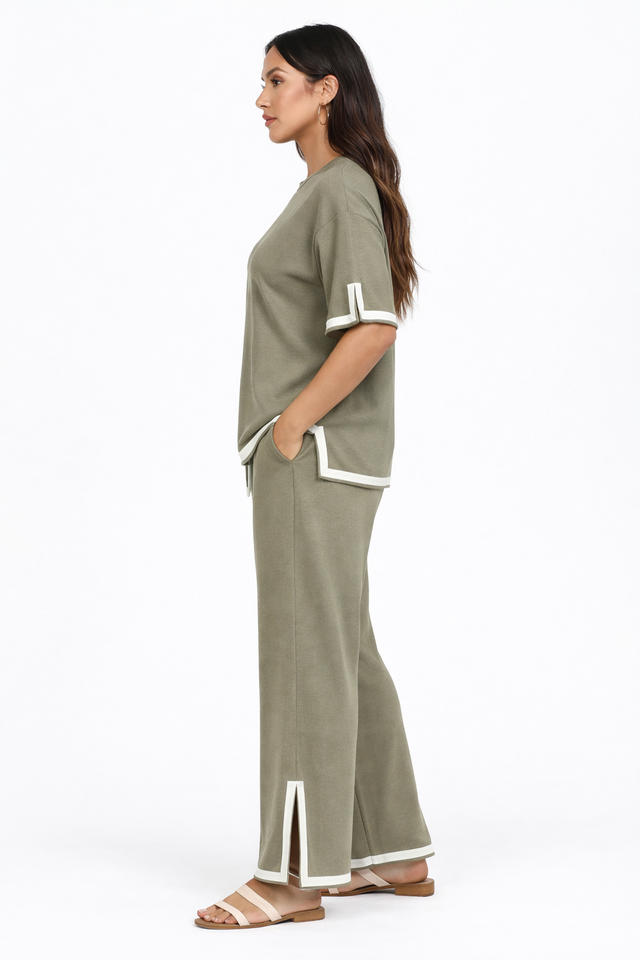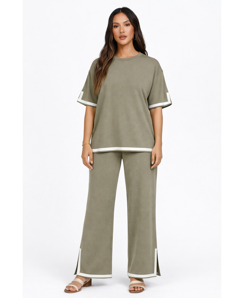 ชุดเซ็ตเสื้อยืดโอเวอร์ไซส์ผ้าคอตตอนผสมเนื้อนุ่มพรีเมียมและกางเกงขายาวสีเขียวมะกอกสำหรับผู้หญิง พร้อมขอบตัดสี