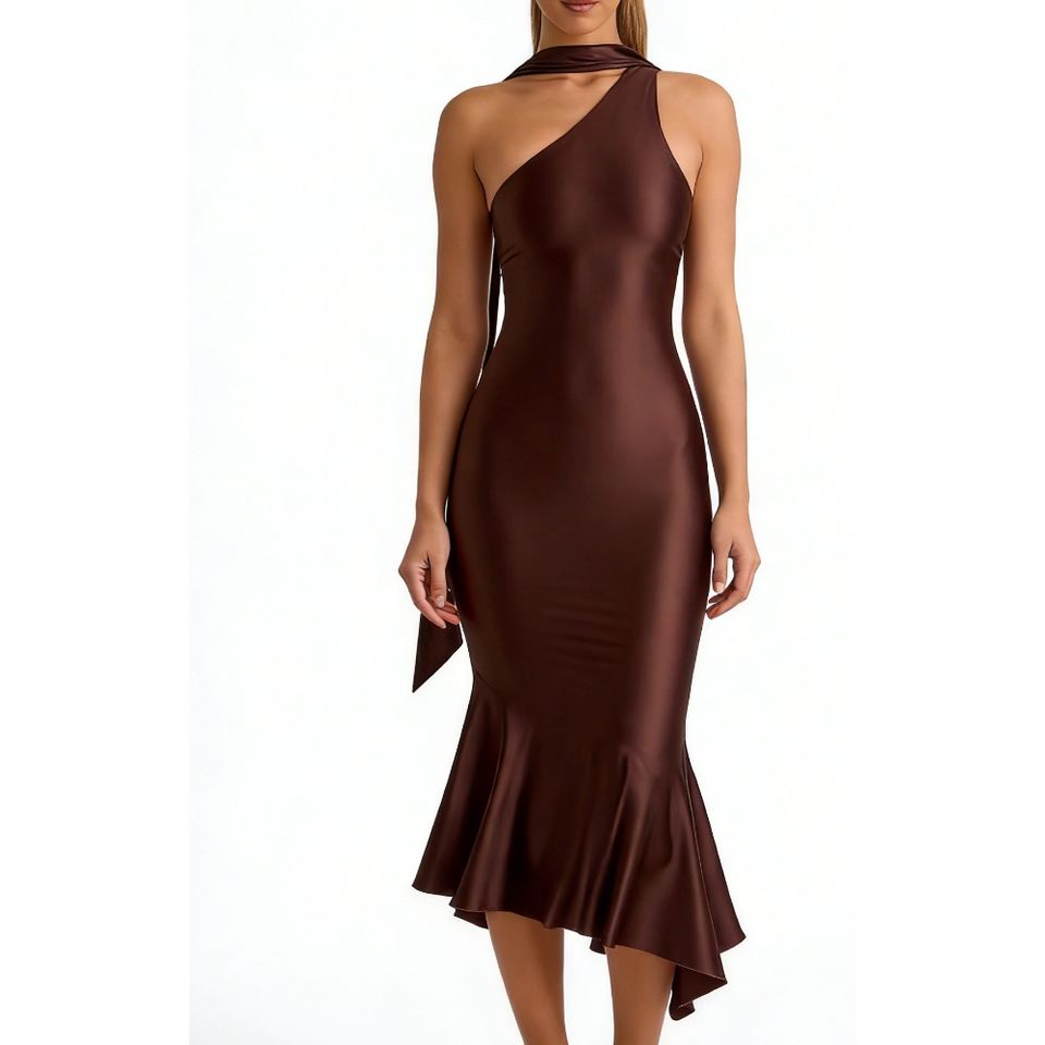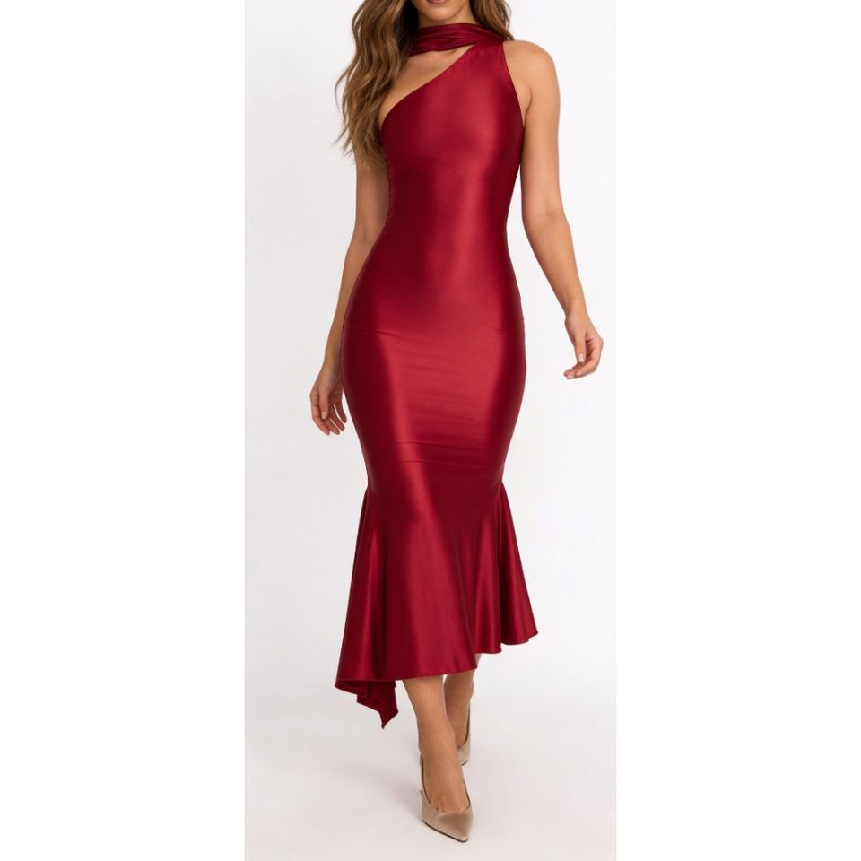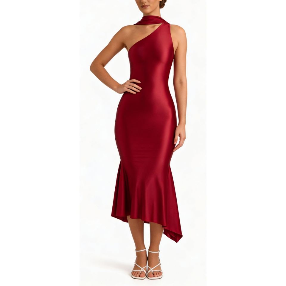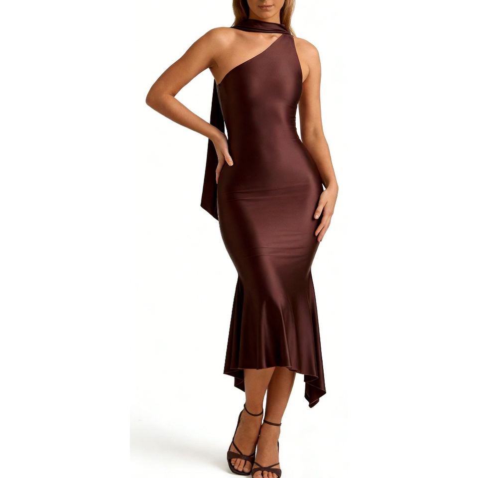 เดรสยาวปานกลางแบบไหล่เดียวสำหรับผู้หญิง - ชุดเดรสทรงปลายหางปลาประดับผ้าพันคอ เสื้อผ้าผู้หญิง ชุดเดรสผู้หญิง แฟชั่น