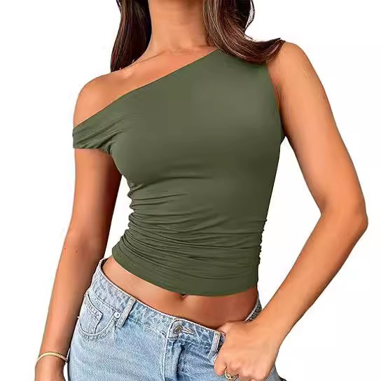 เสื้อยืดผู้หญิงแบบไหล่เดียว ผ้ารัดรูป ยืดหยุ่น นุ่ม สวมใส่สบาย แขนสั้น แฟชั่นทันสมัย