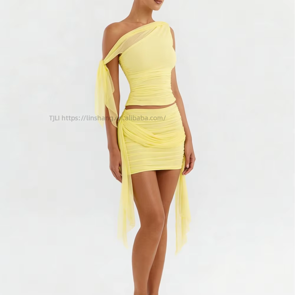ชุดเซ็ตสองชิ้นสำหรับผู้หญิงแบบไหล่เดียวผ้าซีทรูผูกโบว์รัดรูป - เสื้อครอปและกระโปรงสั้นสำหรับงานปาร์ตี้แฟชั่น
