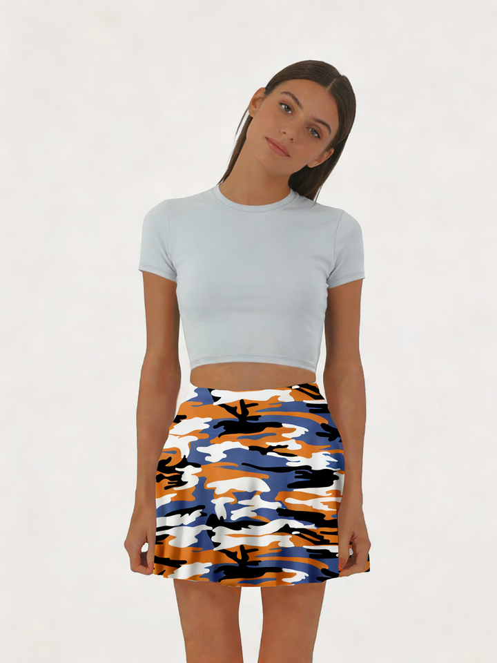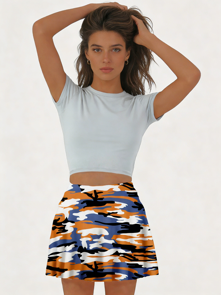กระโปรงมินิเอวธรรมชาติสีส้มน้ำเงินสำหรับผู้หญิง-กระโปรงทรงเอแบบยืดได้ กระโปรงลำลองแบบพลีท ผ้าใยนม