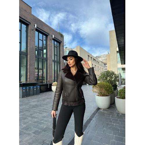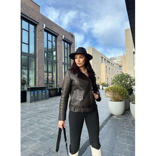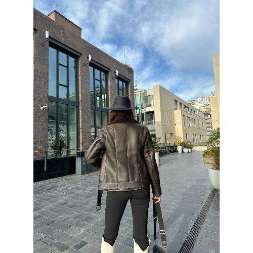 Women’s Short Shearling Jacket – Irish Merino Leather, Khaki-Brown Color, Cropped Cut
