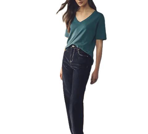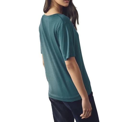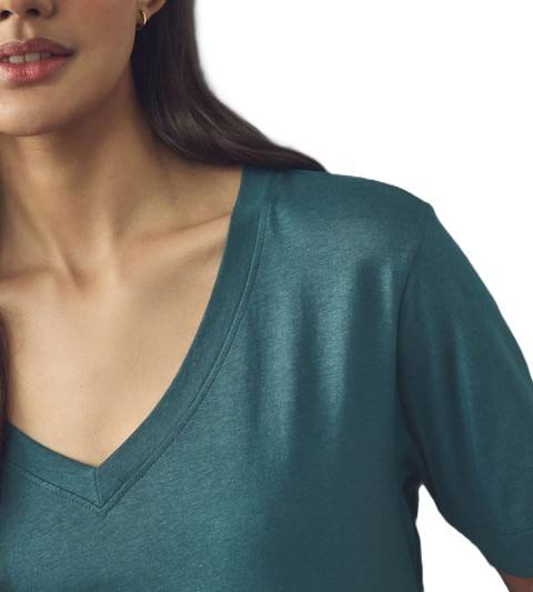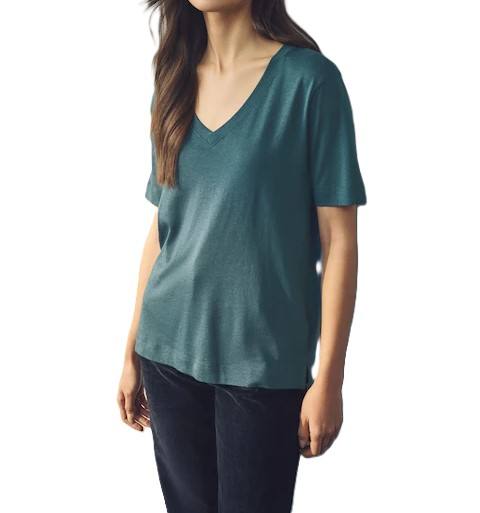 เสื้อยืดคอวีลึกโอเวอร์ไซส์สำหรับผู้หญิงเสื้อยืดแขนสั้นเปิดไหล่ตกออกแบบโลโก้ระบายอากาศได้ดีดีไซน์ทันสมัยสีน้ำเงินอมเขียวทรงหลวม