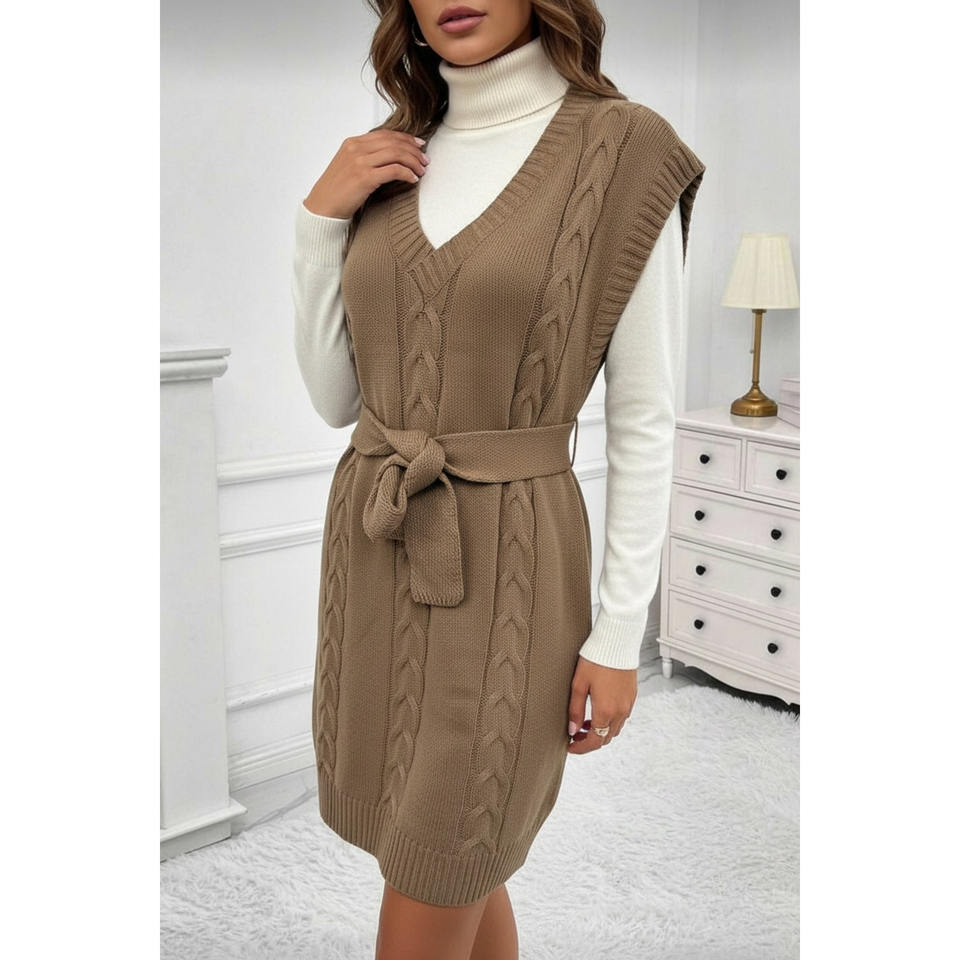 เดรสไหมพรมคอวีทรงโอเวอร์ไซส์สำหรับผู้หญิง สีน้ำตาล