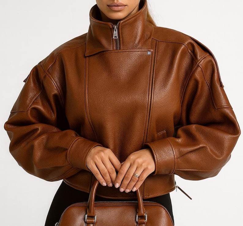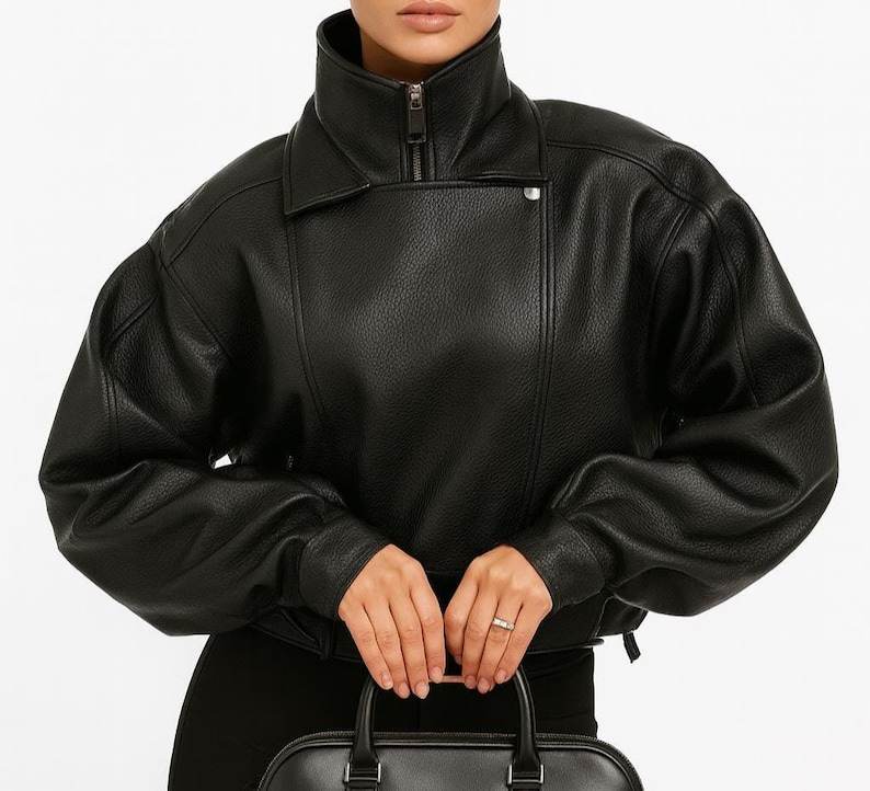 เสื้อแจ็คเก็ตหนังแท้ทรงบอมเบอร์โอเวอร์ไซส์สำหรับผู้หญิง พร้อมเข็มขัด สไตล์ไบค์เกอร์ ซิปหน้า