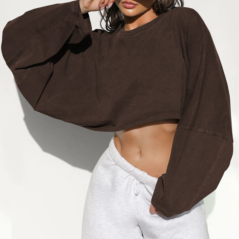 Women's Oversized Crop Top T Shirt Casual Drop Shoulder Crew Neck Long Sleeve Solid Color Loose Pullover Streetwear Winter Front