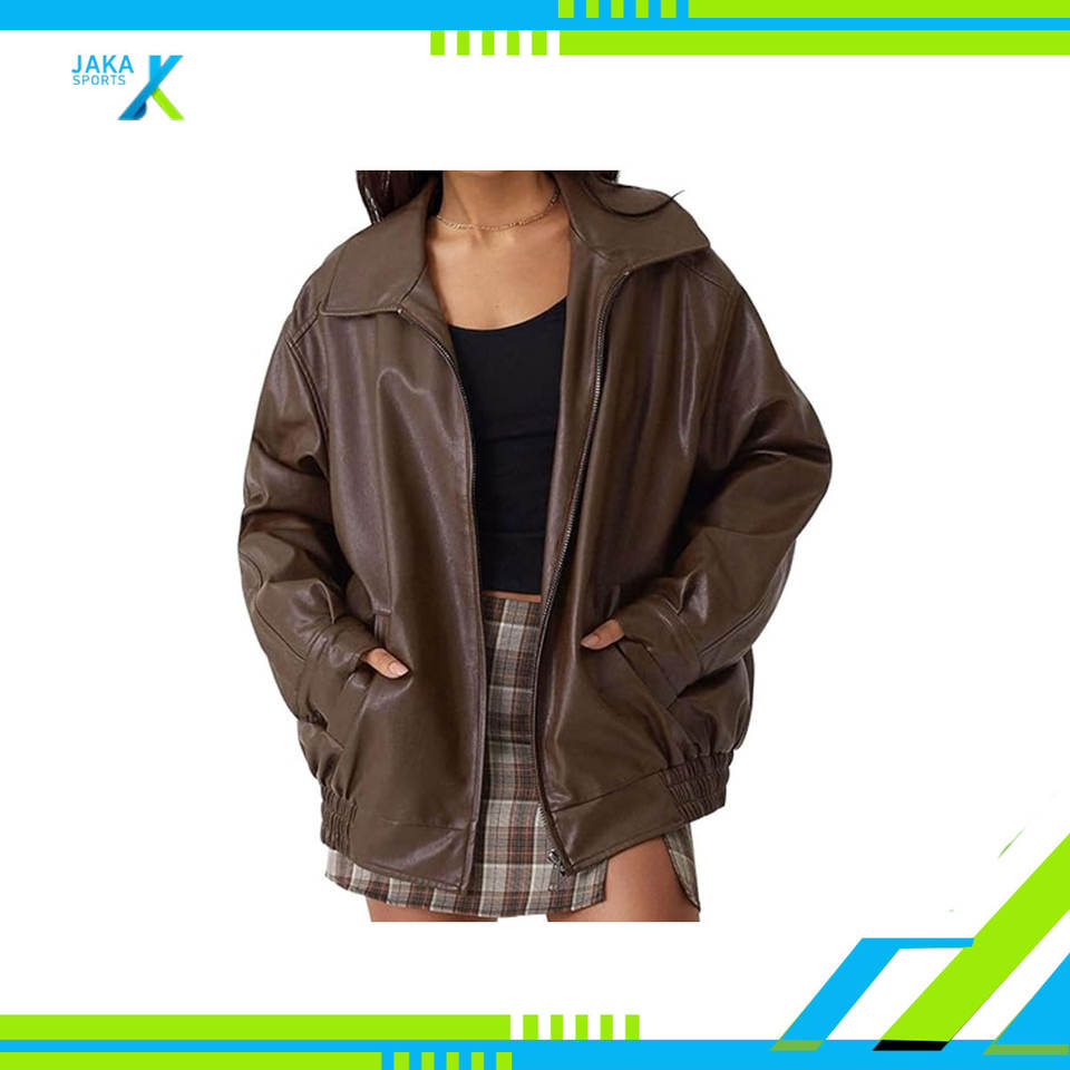 เสื้อแจ็คเก็ตหนังเทียมทรงโอเวอร์ไซส์สำหรับผู้หญิง สไตล์มอเตอร์ไซค์ แบบเป็นทางการ พร้อมซิปปิด ทรงหลวม ผลิตจากวัสดุรักษ์โลก เนื้อหนา