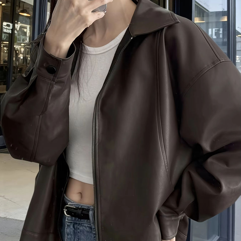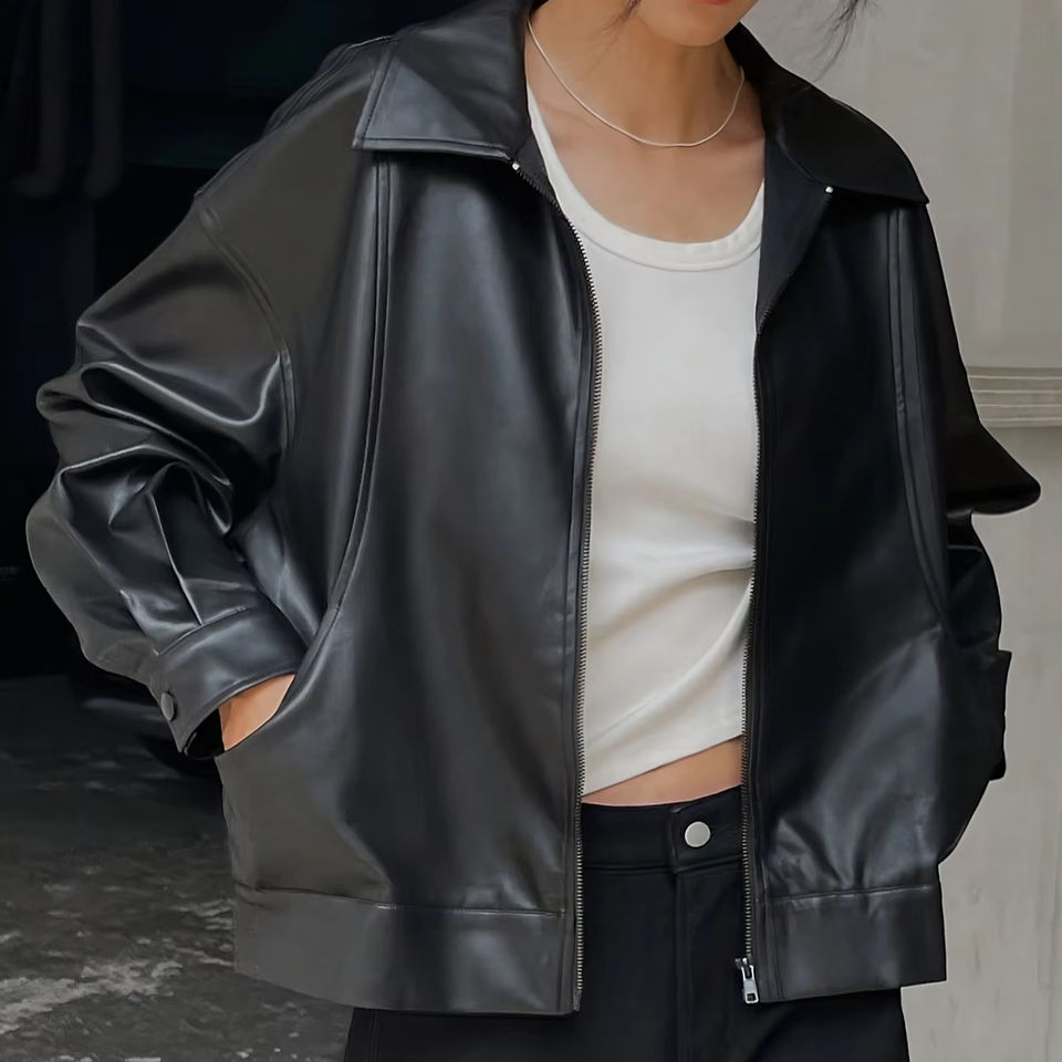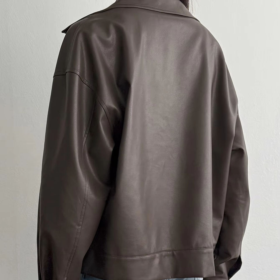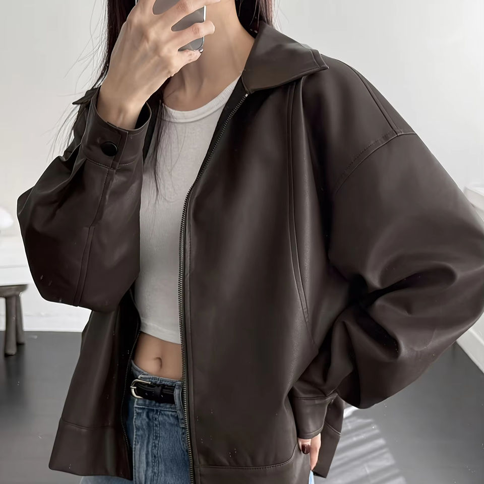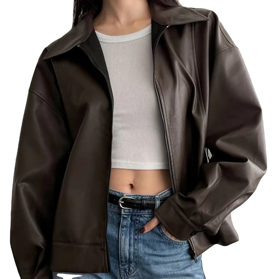 เสื้อแจ็คเก็ตหนังผู้หญิงทรงโอเวอร์ไซส์ สไตล์ลำลองสำหรับฤดูใบไม้ร่วงและฤดูหนาว แบบมีดีไซน์ดิบๆ สำหรับขี่มอเตอร์ไซค์