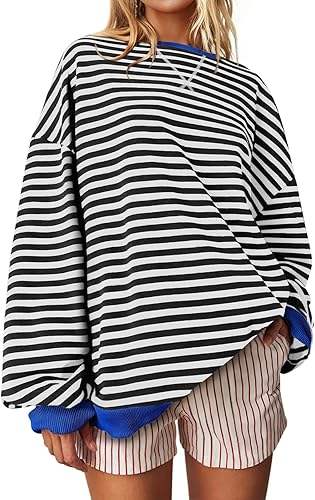 เสื้อสเวตเตอร์คอกลมลายทางสำหรับผู้หญิง, เสื้อออกกำลังกายแขนยาวลำลองทรงหลวมเสื้อใส่ฤดูหนาวพร้อมเสื้อสวมหัวสีพื้น