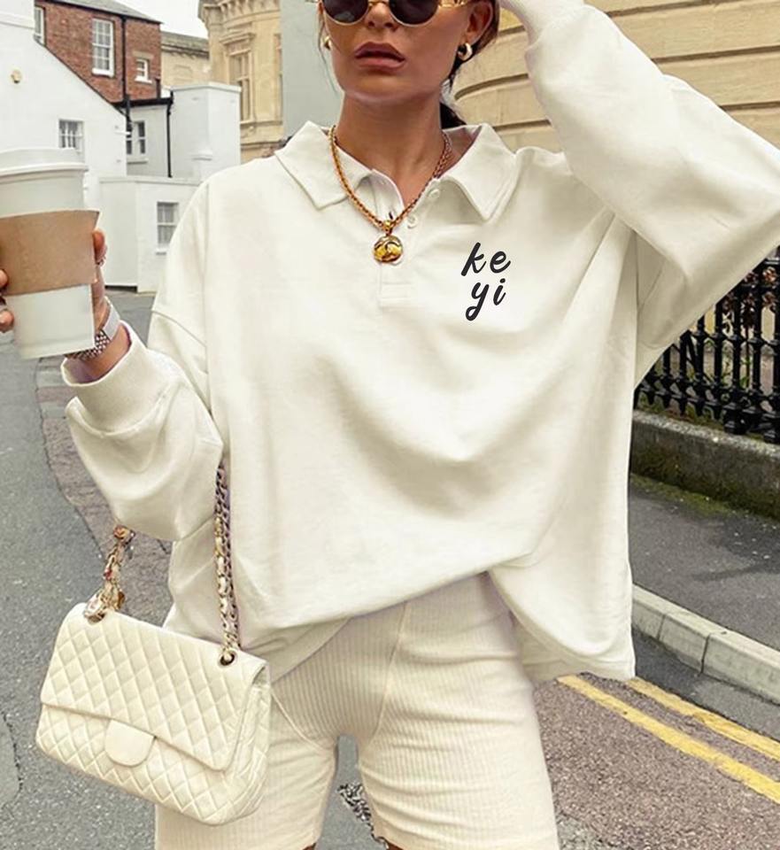 เสื้อสเวตเตอร์โอเวอร์ไซส์สำหรับผู้หญิงปกเสื้อแบบเปิดลงพิมพ์โลโก้ผ้าไหมผ้ายืดพันแขนเสื้อสตรีทฤดูใบไม้ร่วง/ฤดูหนาว