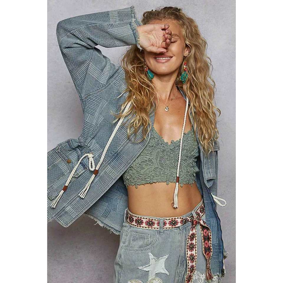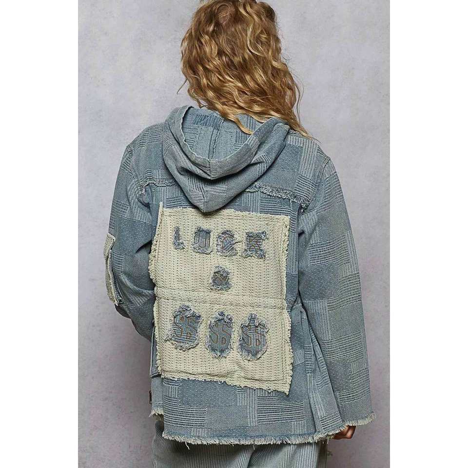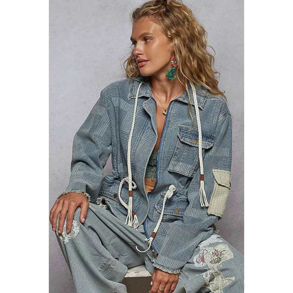 เสื้อแจ็คเก็ตเดนิมมีฮู้ดแบบมีเชือกผูกและซิปสำหรับผู้หญิง สีฟ้าอมเทา รุ่น S POL ขอบดิบ ยี่ห้อ Veloro