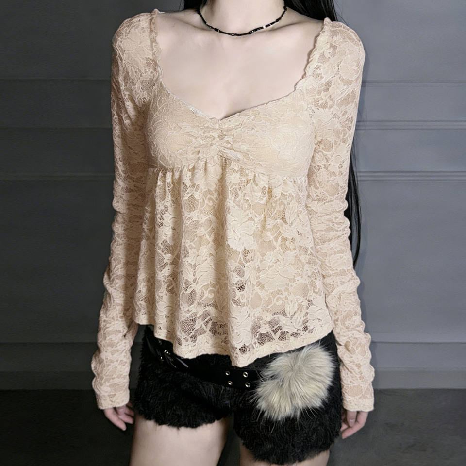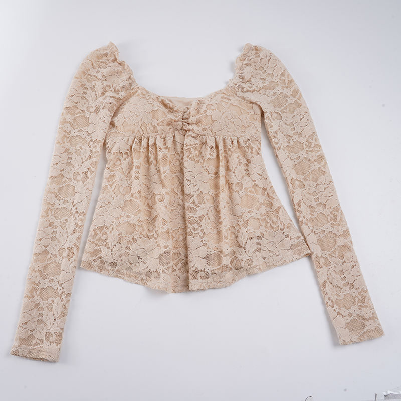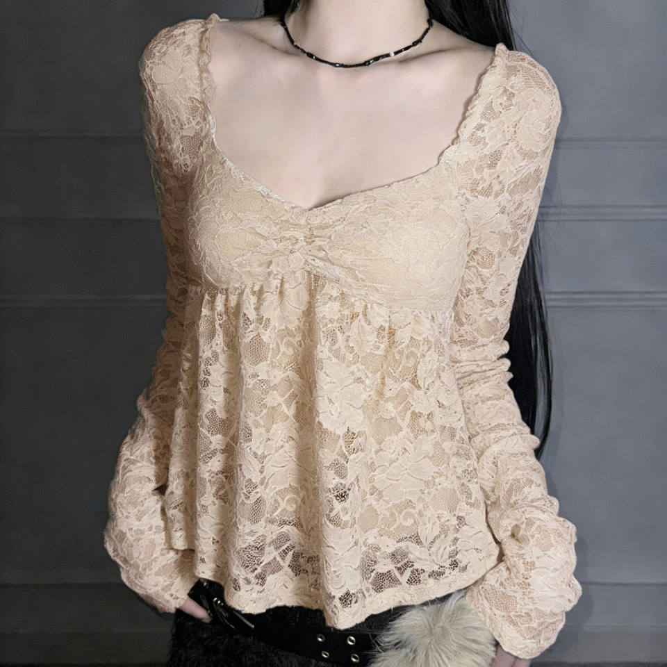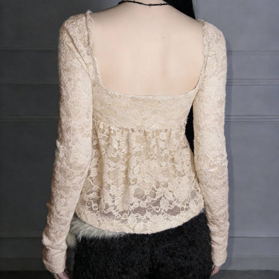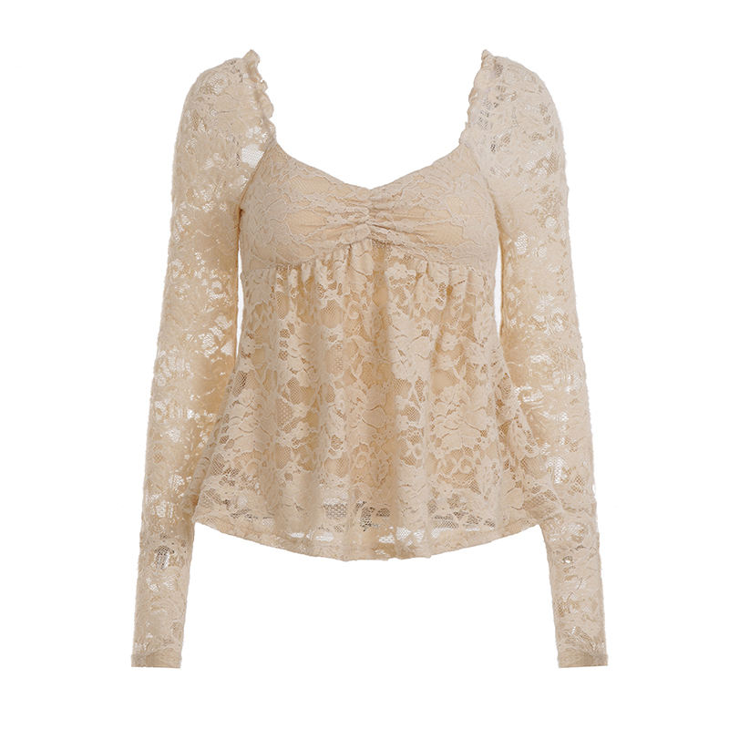 เสื้อยืดแขนยาวคอเหลี่ยมแต่งลูกไม้สำหรับผู้หญิง ผ้าไนลอนรักษ์โลก ทรงเข้ารูป พร้อมบราในตัว