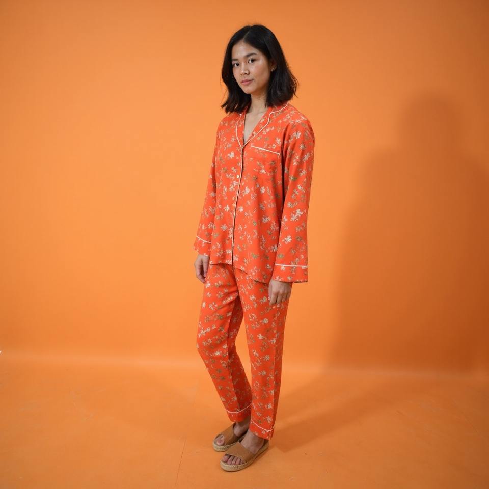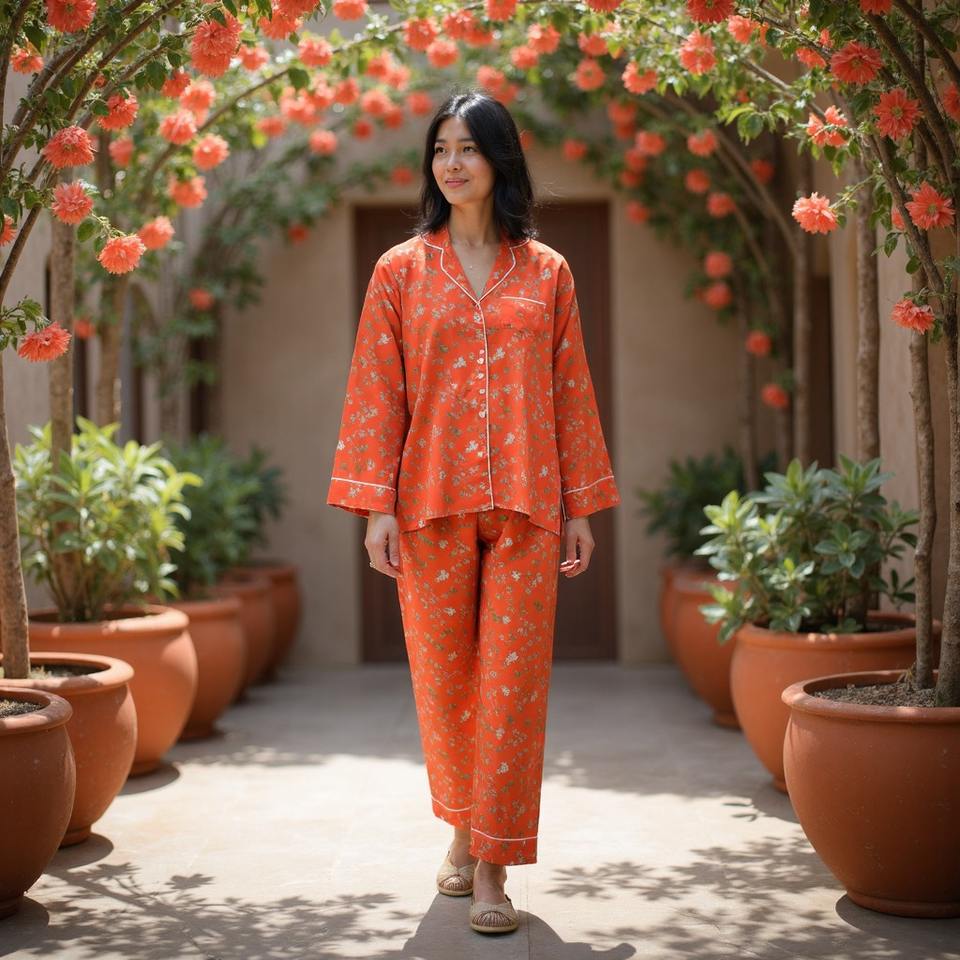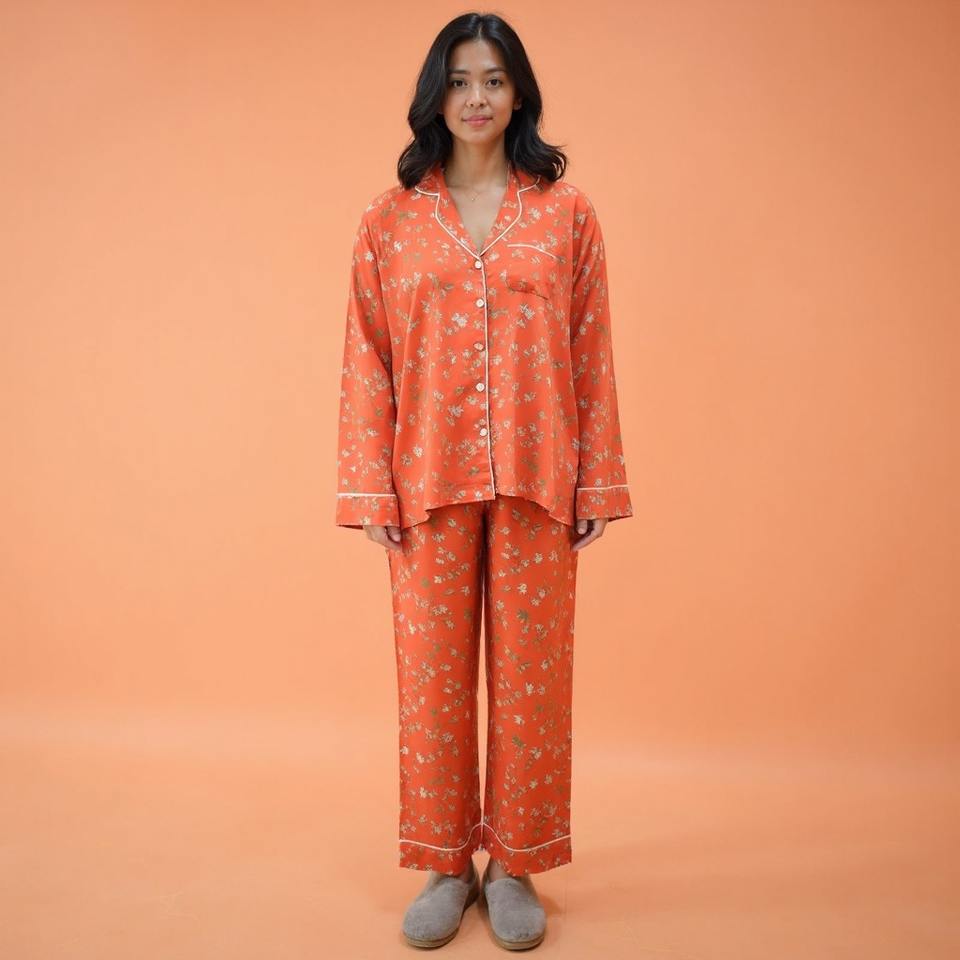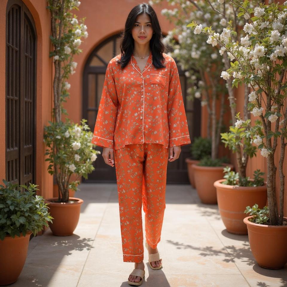 เซ็ตชุดนอนผู้หญิงผ้าฝ้ายพิมพ์ลายดิจิตอล, ชุดนอนมีกระดุม