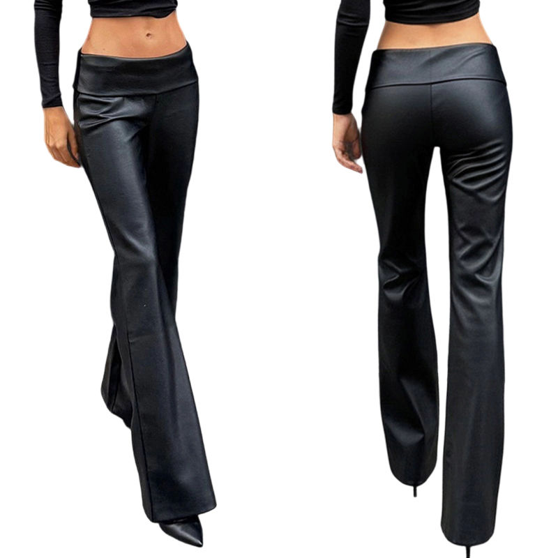 กางเกงผู้หญิงทรงหลวมเอวต่ำผ้ายืดสีดำหนัง PU รักษ์โลก ระบายอากาศได้ดี ป้องกันไฟฟ้าสถิตย์ แต่งลายแบบโกธิค คอลเลคชั่นฤดูใบไม้ร่วง-ฤดูหนาว ปี 2025