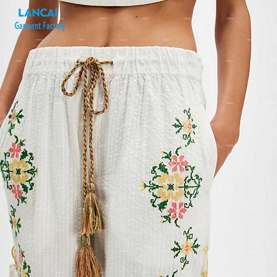 กางเกงผู้หญิงขาตรงกว้างผ้าฝ้ายทรงหลวมแบบลำลองผ้ายืดมีกระเป๋าข้างปรับได้