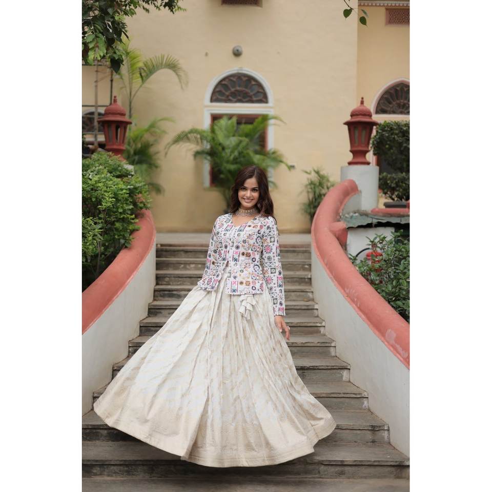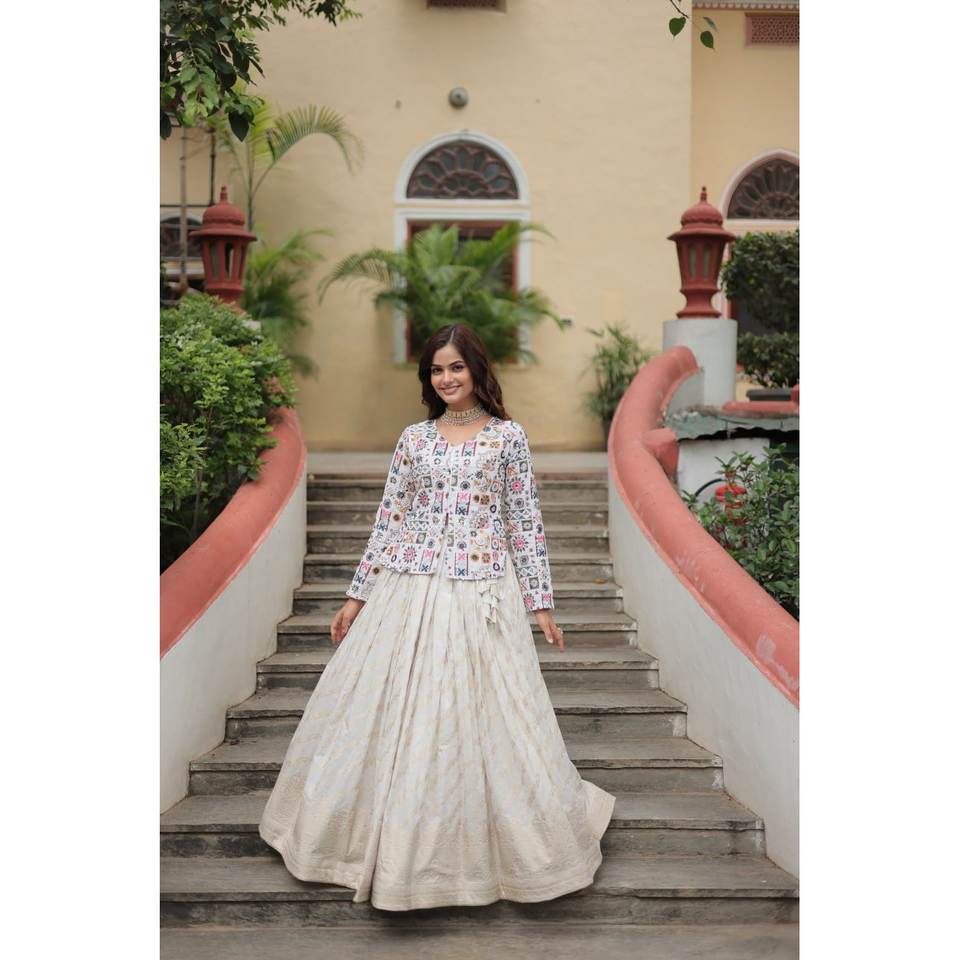 ชุดเสื้อและ lehenga สำหรับงานปาร์ตี้ของผู้หญิงปักเลื่อมด้วยด้าย