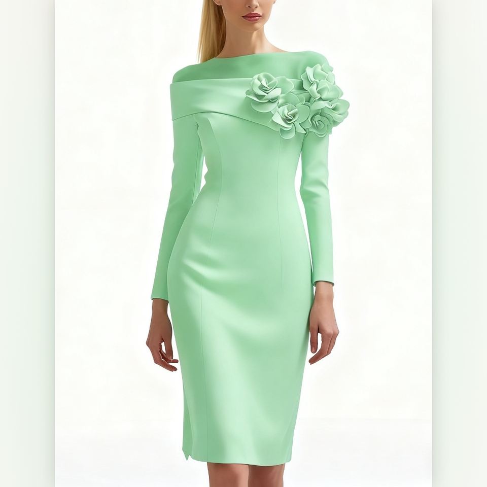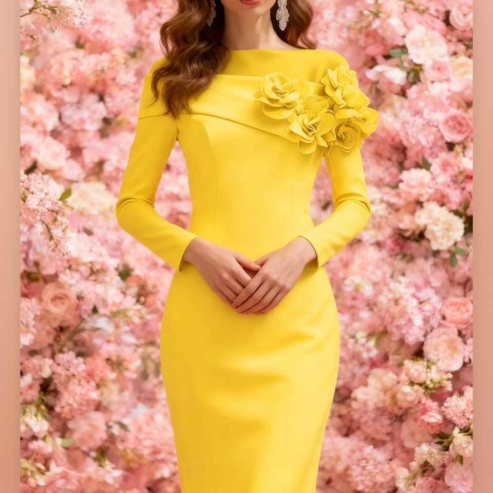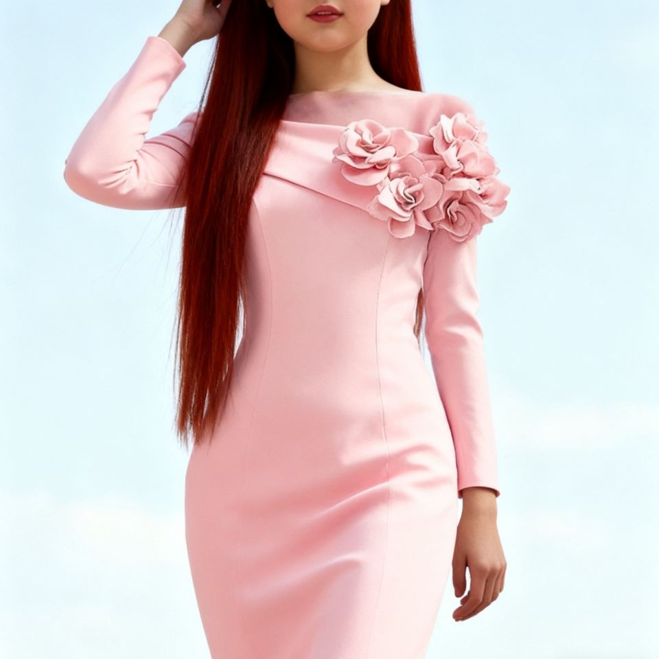เดรสแฟชั่นแขนยาวทรงเข้ารูปสีพื้นประดับลายดอกไม้ 3 มิติด้านข้าง คอทรงกลมแบบปะติดปะต่อสำหรับผู้หญิง