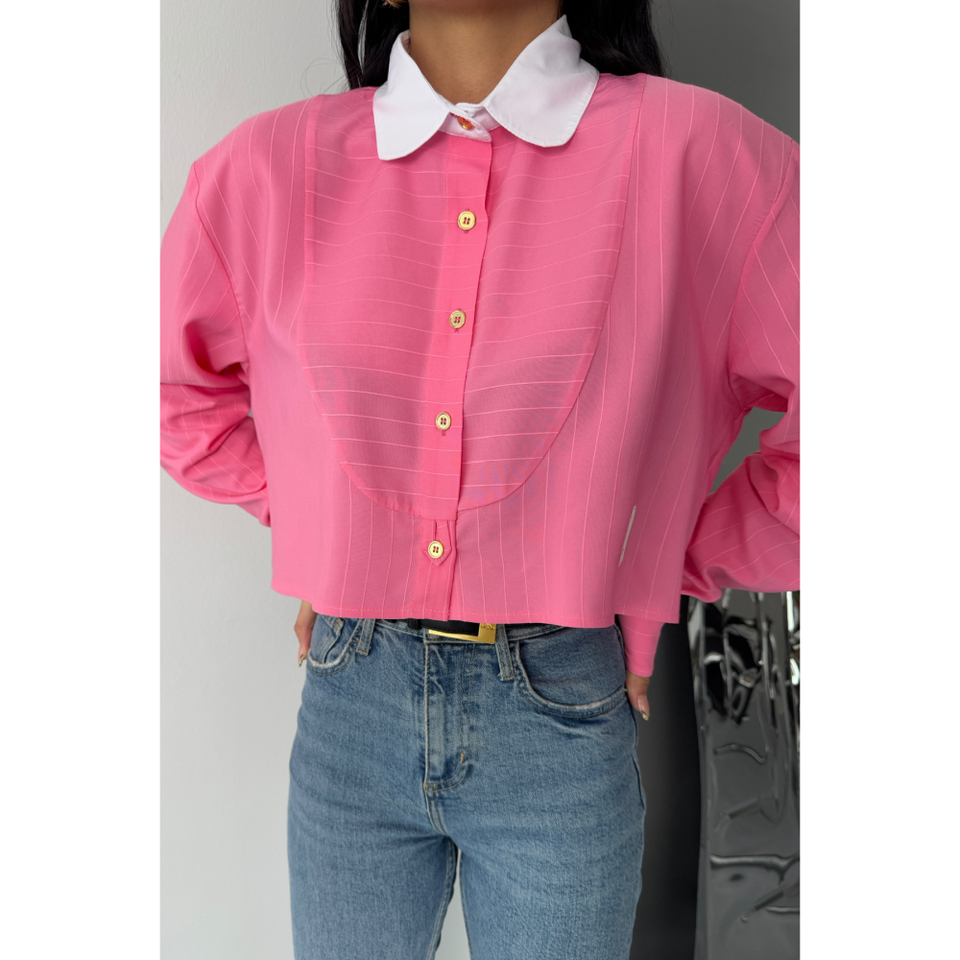 เสื้อครอปสีชมพูสำหรับผู้หญิง คอปกสีขาว พร้อมดีเทลป้าย