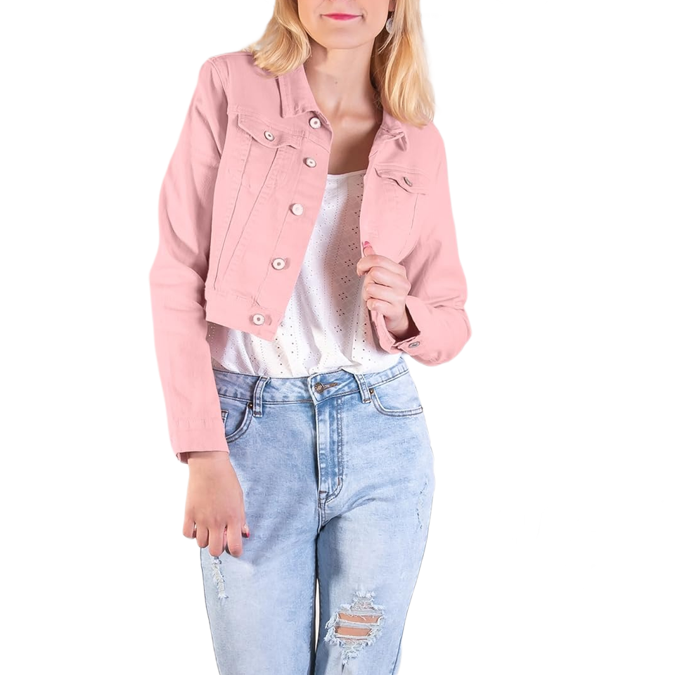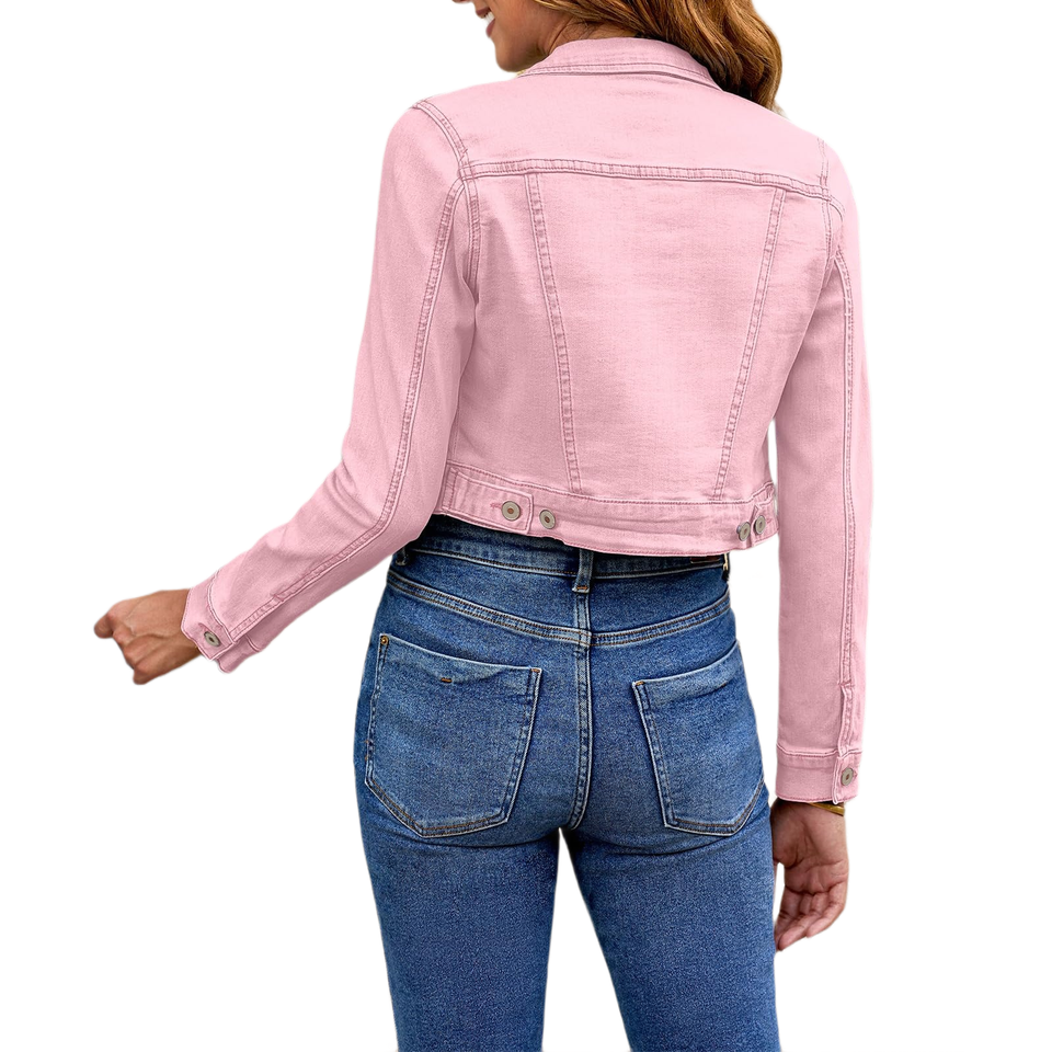 Women's Pink Cropped Denim Jacket Short Jean Coat Casual Fashion with Fresh Style Urban Vibe Long Sleeve Jacket