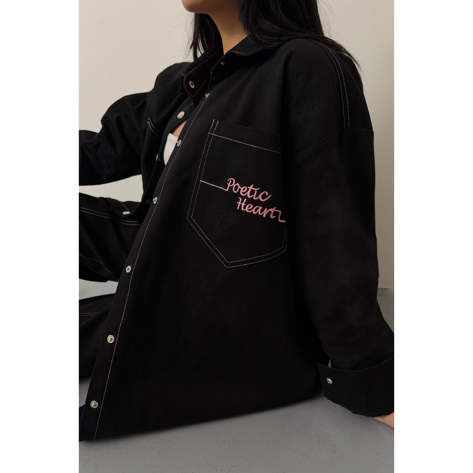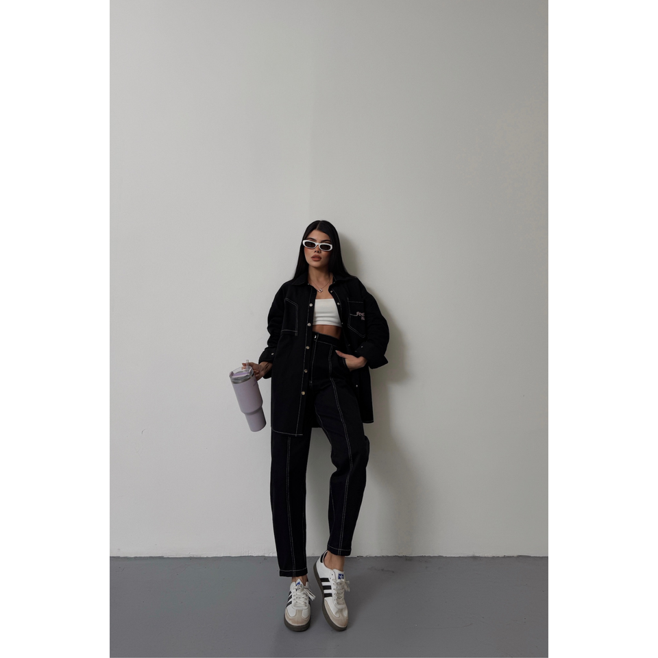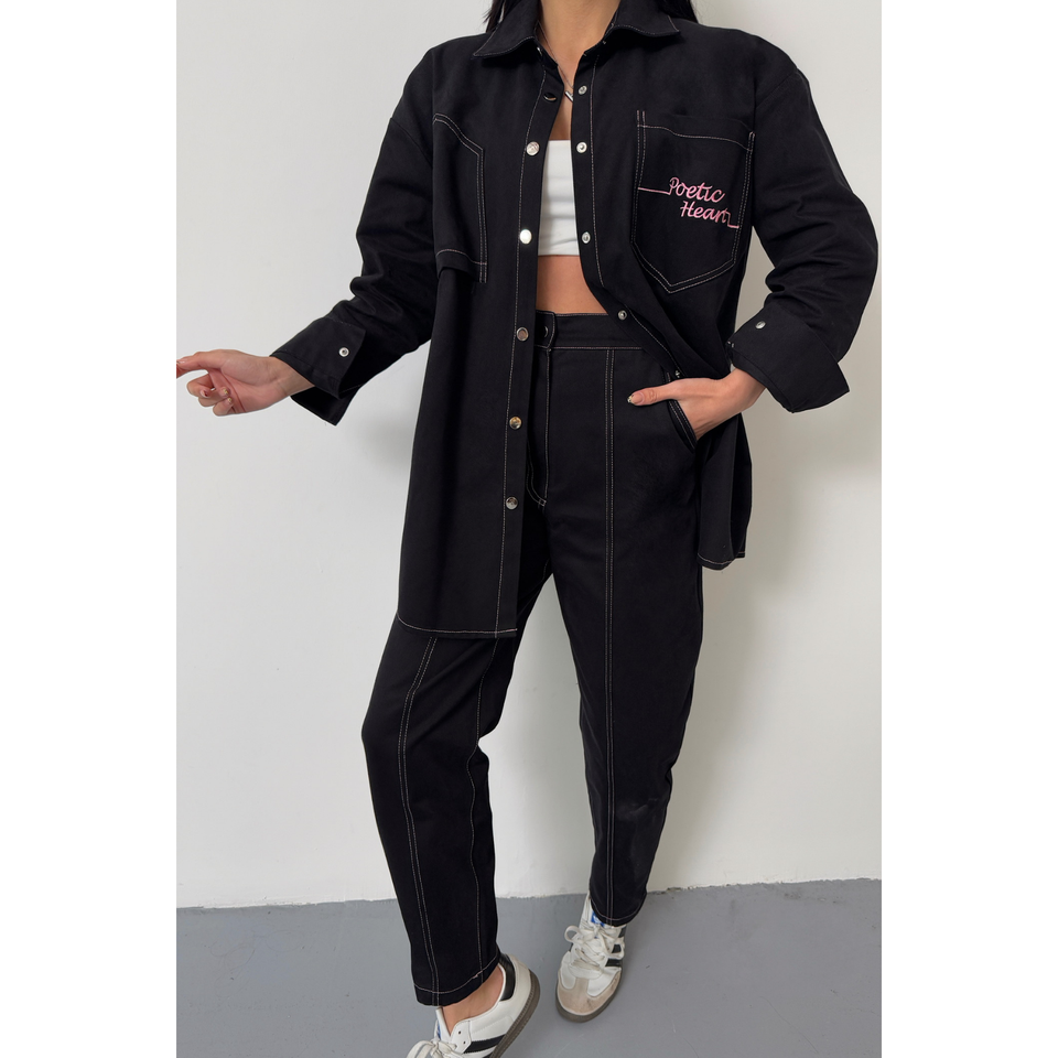 ชุดเสื้อเชิ้ตเดนิมสีชมพูและกางเกงขายาวสำหรับผู้หญิง