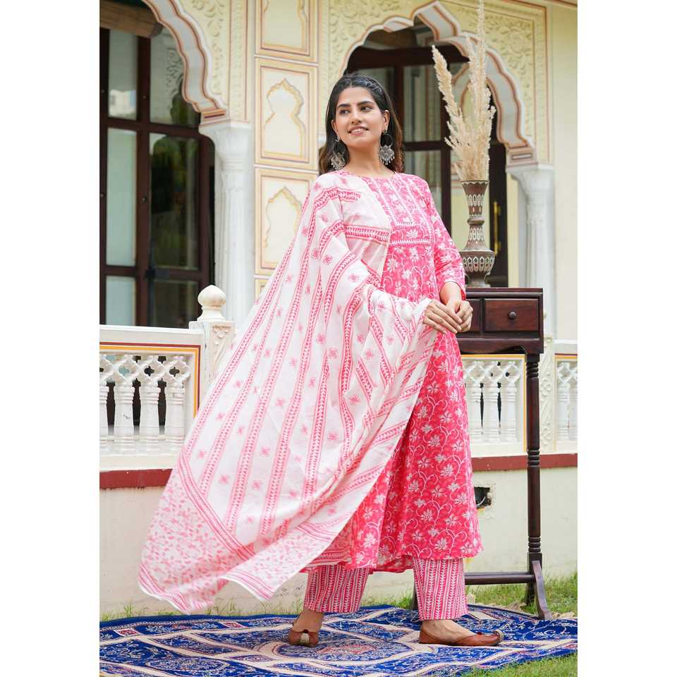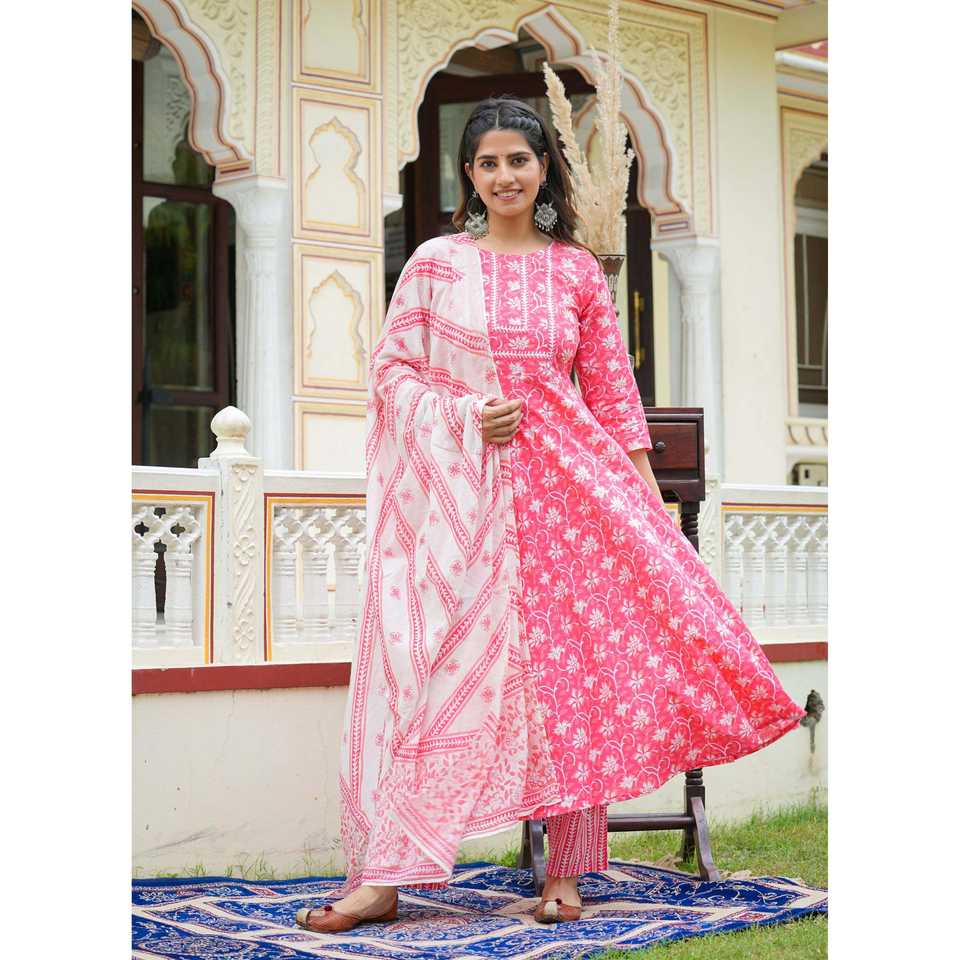 ชุด anarkali kurta พิมพ์ลายดอกไม้สีชมพูพร้อมกางเกงและชุด dupatta
