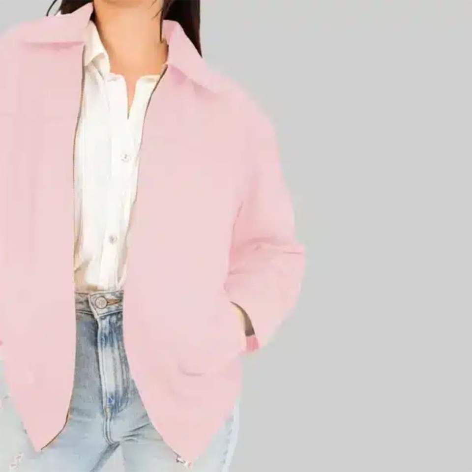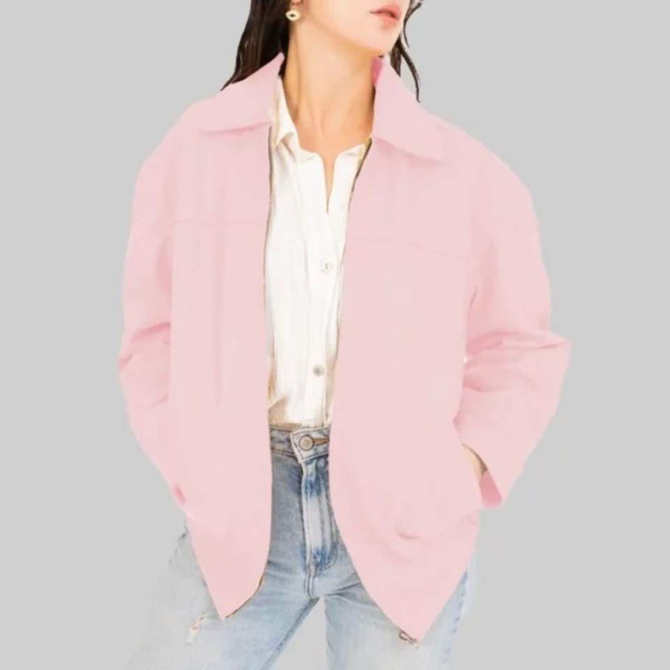 แจ็คเก็ตบอมเบอร์หนังแท้สีชมพูสำหรับผู้หญิง ทรงโอเวอร์ไซส์ ปิดด้วยซิป เคลือบผิวทันสมัย ทรงหลวม สไตล์สตรีทแวร์
