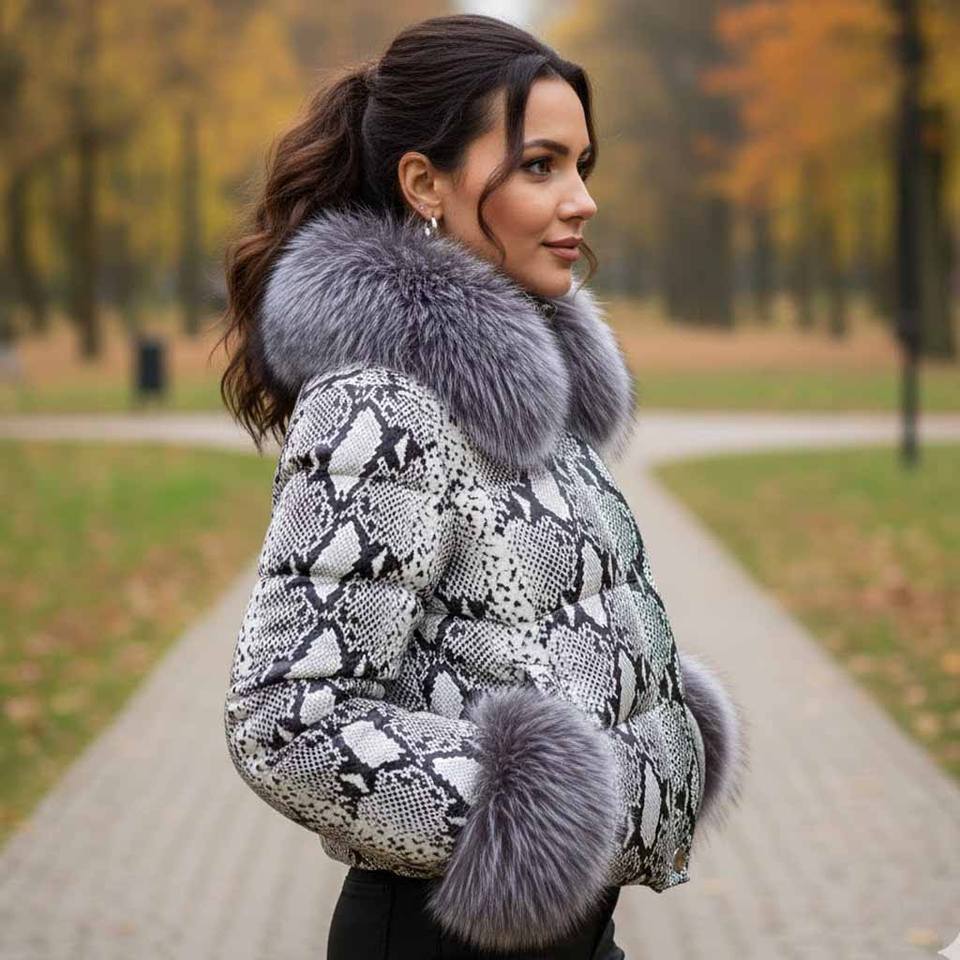 เสื้อแจ็คเก็ตหนังพัฟเฟอร์ลายสก็อตสำหรับผู้หญิง พร้อมซิปและปกขนสุนัขจิ้งจอก เสื้อกันลมสำหรับฤดูหนาว