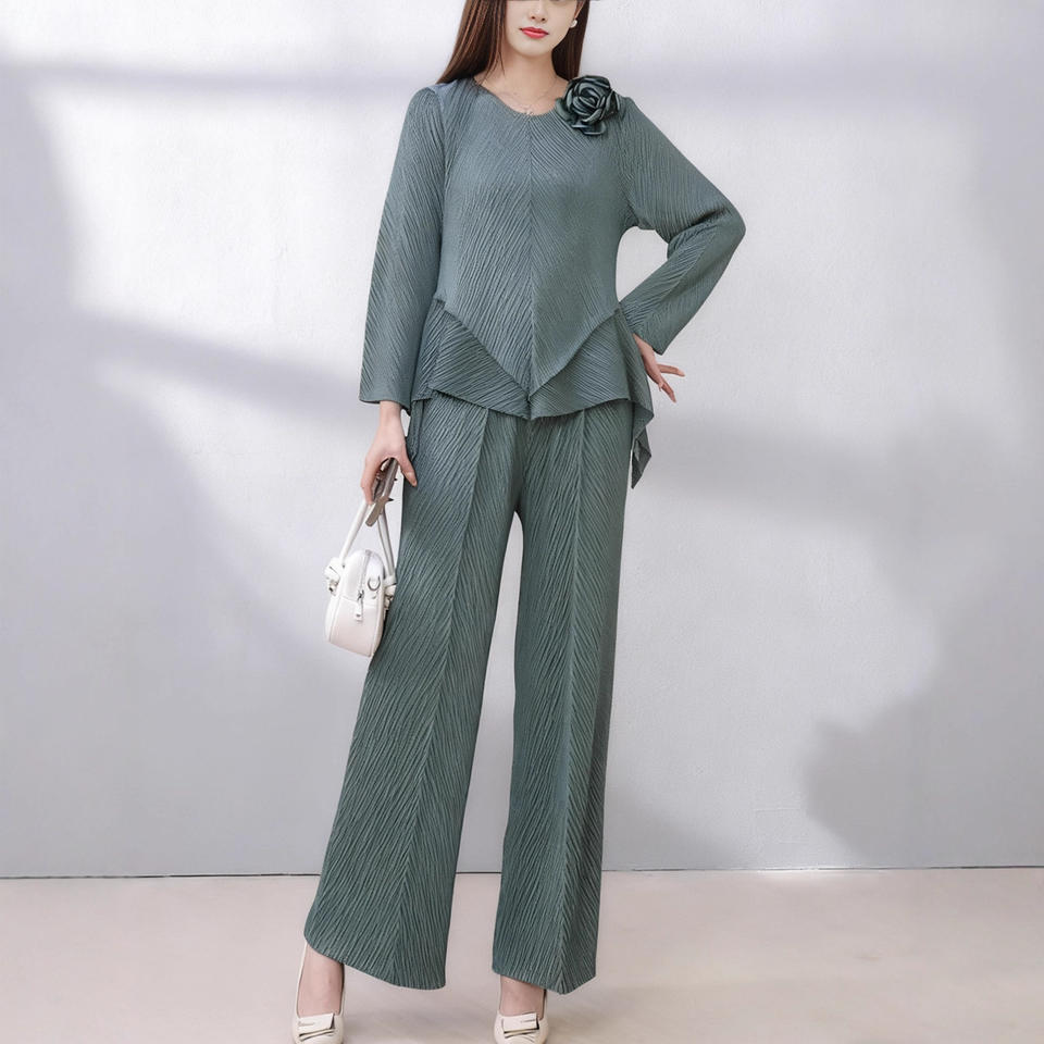 ชุดเซ็ตสองชิ้นสำหรับผู้หญิง ผ้าพลีทเรียบง่าย สไตล์ลำลอง เสื้อครอปยาวถึงข้อเท้าและกางเกงขายาวทรงกว้าง มีซิป ลายดอกไม้ 3 มิติ เป็นมิตรกับสิ่งแวดล้อม ทรงหลวม