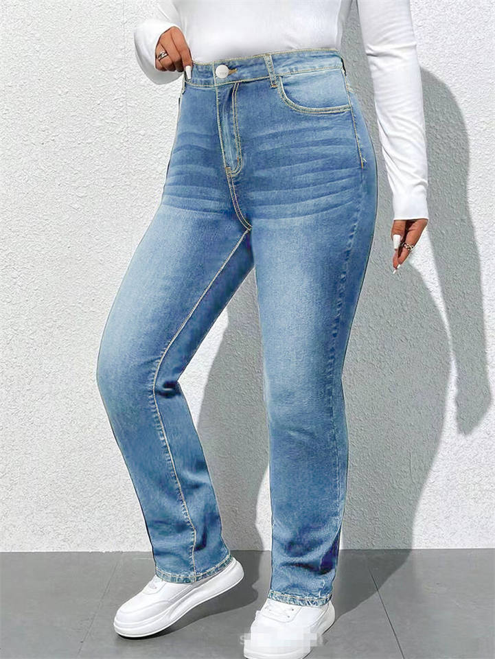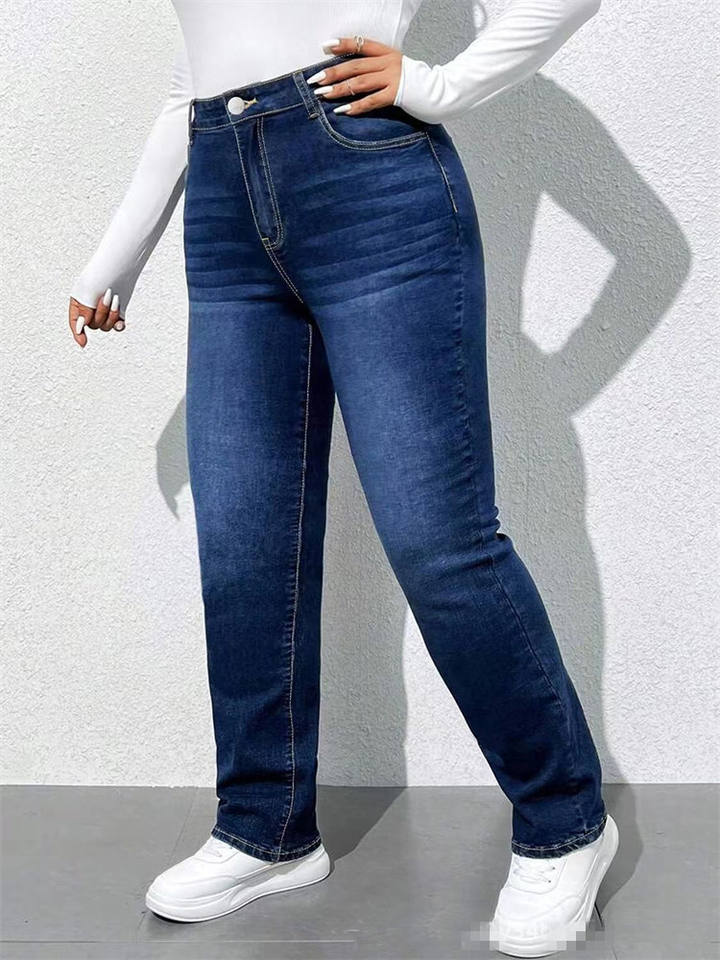 กางเกงยีนส์ทรงตรงสีน้ำเงินเข้มสำหรับผู้หญิงไซส์ใหญ่ ทรงปกติ ผ้ายืด ทรงกระบอกกลาง แบบ OEM ลุคสบายๆ ซักแล้ว ใส่ได้ในฤดูร้อน