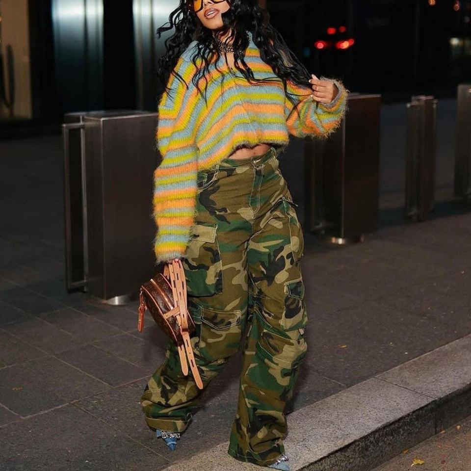 กางเกงยีนส์คาร์โกเอวสูงไซส์ใหญ่สำหรับผู้หญิง ระบายอากาศได้ดี ลายพราง สไตล์ลำลอง ปักลาย