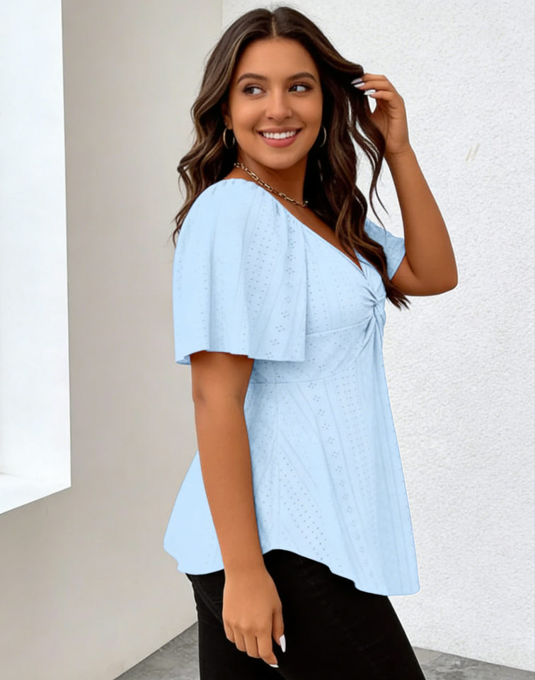 เสื้อเชิ้ต/เสื้อเบลาส์ทรงเปปลัมปักลายฉลุ แขนระบาย คอวี สีฟ้าอ่อน ไซส์พลัสสำหรับผู้หญิง