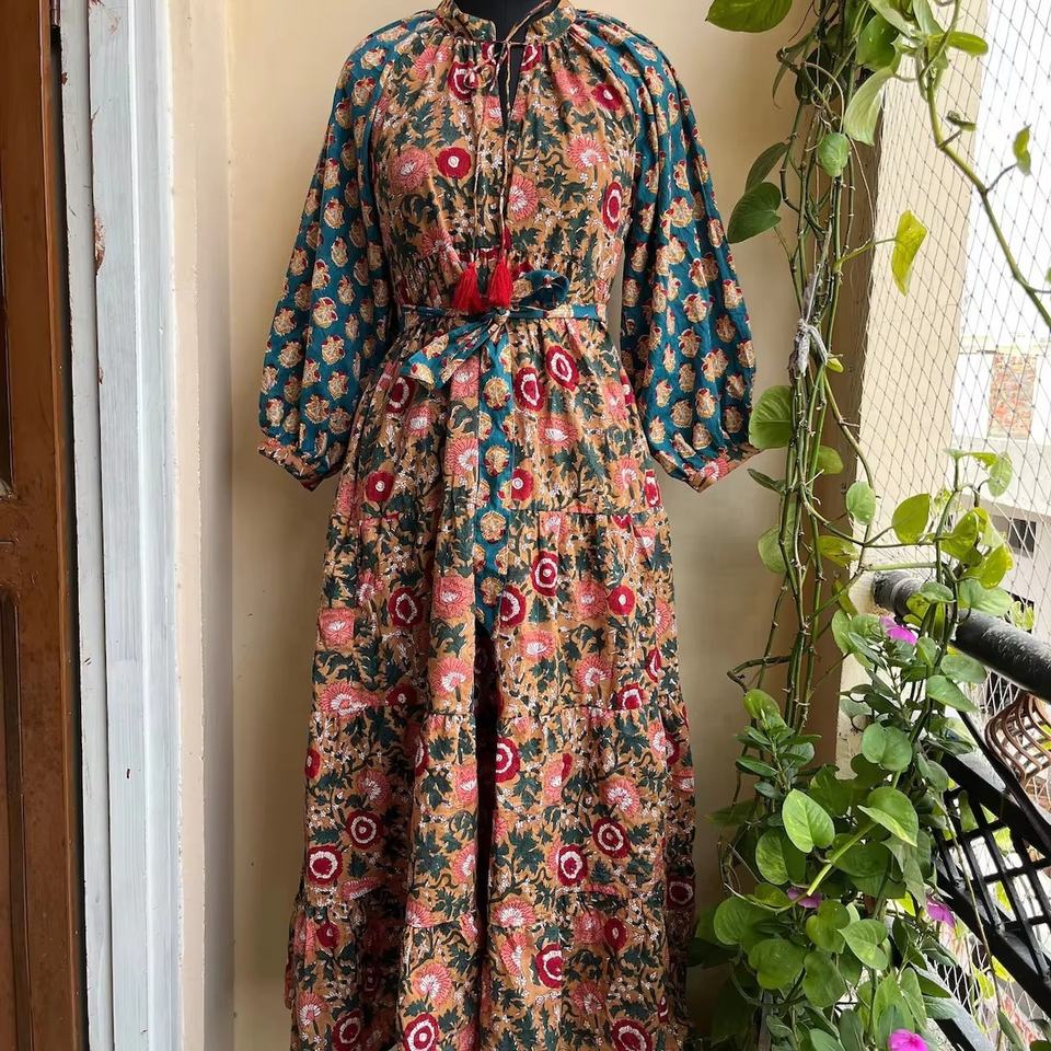 เดรสยาวลายดอกพิมพ์บล็อกผ้าฝ้ายคอวีแขนยาวสำหรับผู้หญิงไซส์พลัส ดีไซน์หรูหรา ราคาโรงงาน