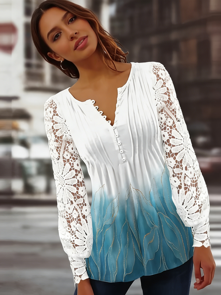 เสื้อผู้หญิงไซส์ใหญ่ทรงหลวม แขนยาว คอวี แต่งลูกไม้ สีขาวไล่เฉดสีน้ำเงิน ผ้าใยนม แต่งลายทอง ใส่สบายๆ