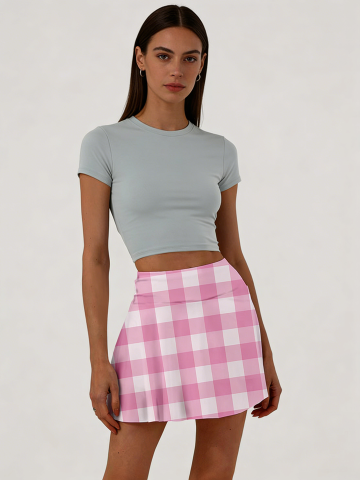 กระโปรงกางเกงทรงเอไลน์สีชมพูลายตารางสำหรับผู้หญิงไซส์พลัส เอวสูง ยืดหยุ่น ป้องกันโป๊ มีกระเป๋า เหมาะสำหรับใส่เล่นกีฬาหรือใส่ลำลองช่วงฤดูร้อน