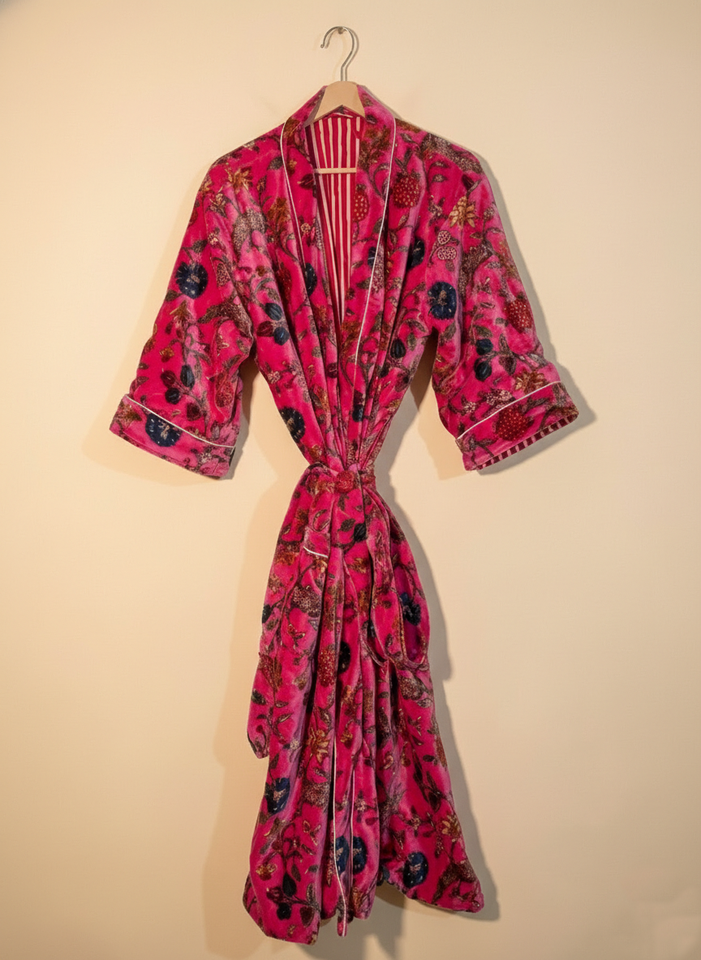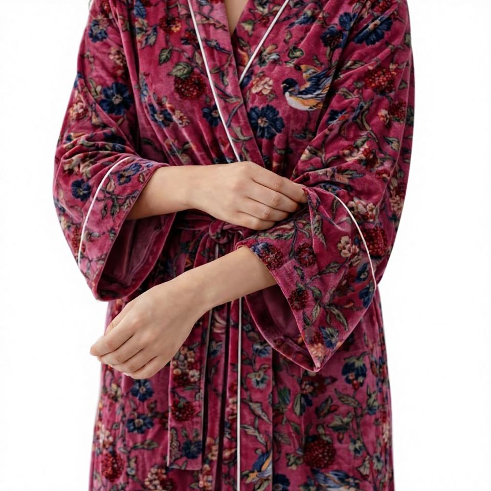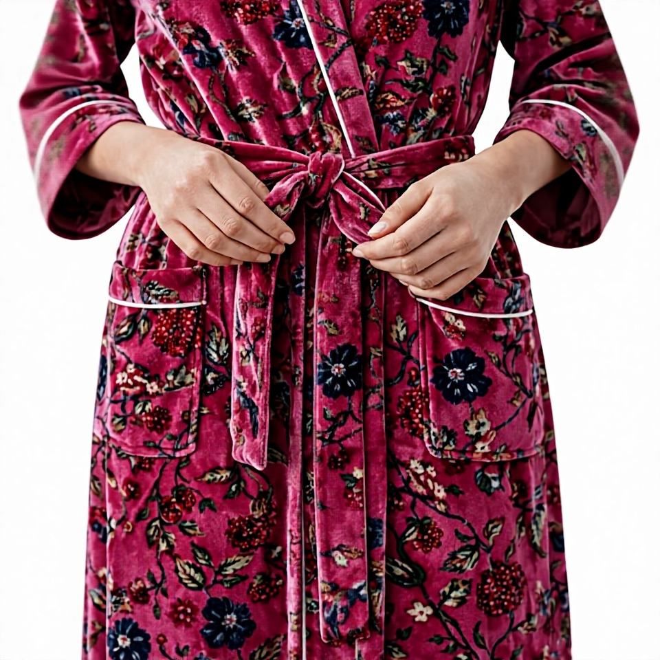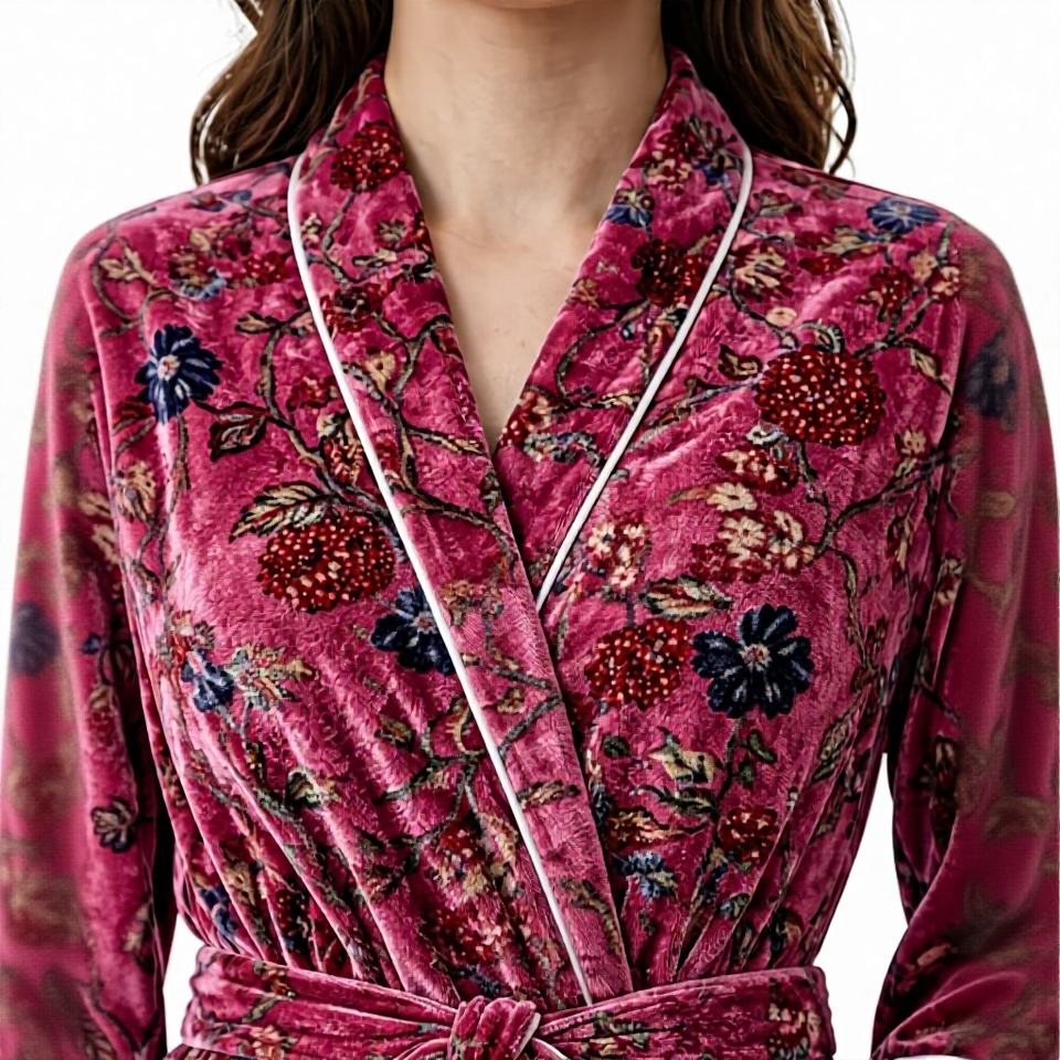 ชุดคลุมกิโมโนกำมะหยี่พิมพ์ลายดอกไม้สไตล์วินเทจหรูหราสำหรับผู้หญิงไซส์พลัส แขนสั้น มีเข็มขัดและกระเป๋า