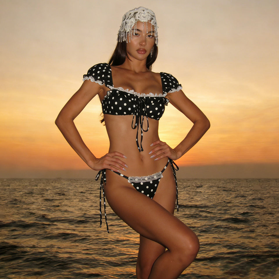 ชุดบิกินี่ลายจุดสำหรับผู้หญิงพร้อมขอบลูกไม้ เสื้อแขนพองและกางเกงผูกข้าง ชุดว่ายน้ำสองชิ้นสำหรับชายหาดและวันหยุด