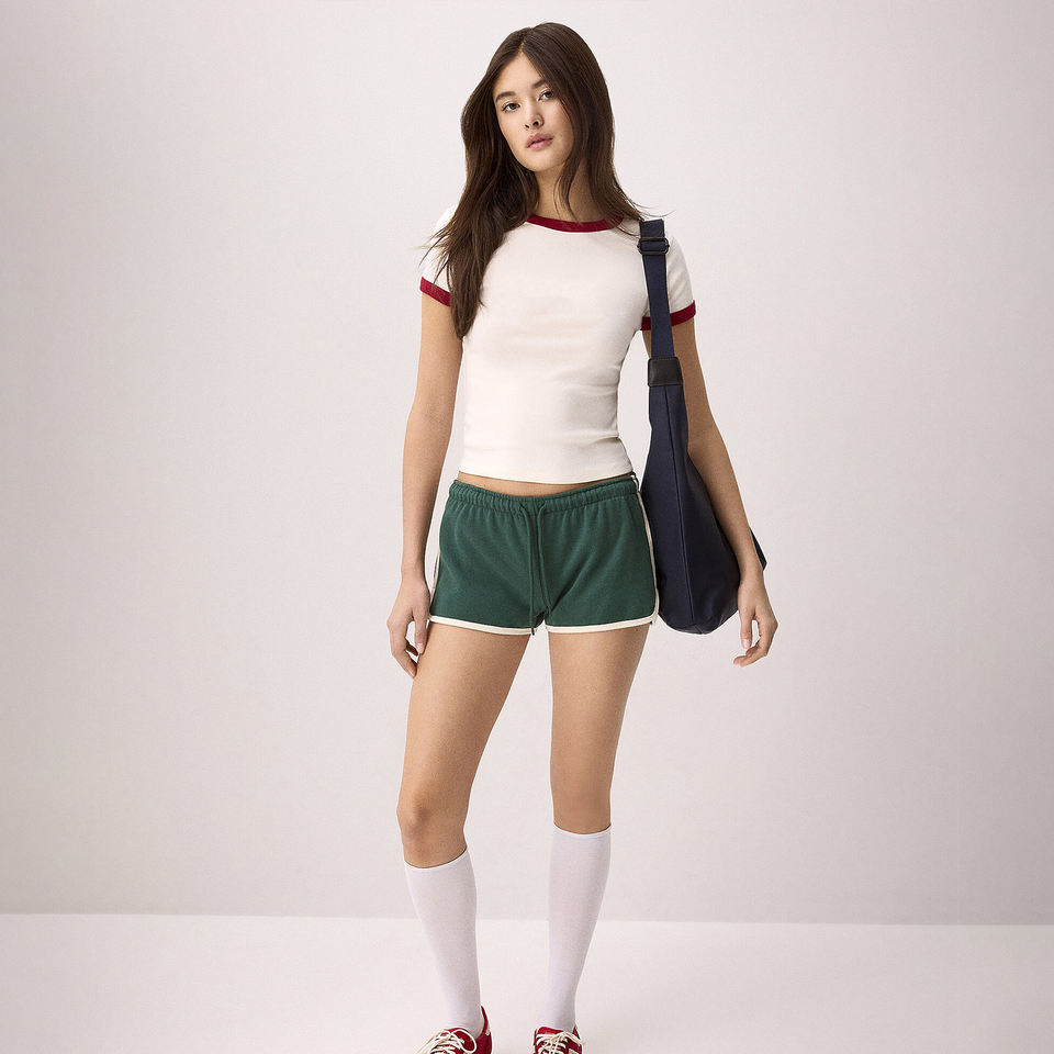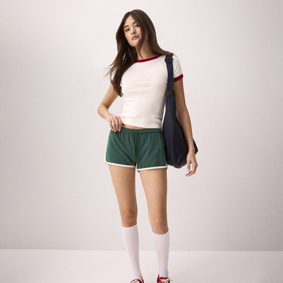 เสื้อยืดคอกลมทรงเบบี้ที พรีเมียม สำหรับผู้หญิง ผ้าฝ้าย 100% ทรงพอดีตัว ความยาวสั้น แต่งขอบตัดสี สำหรับผู้หญิง ขายส่ง รับสกรีนโลโก้ เสื้อสไตล์ Y2K